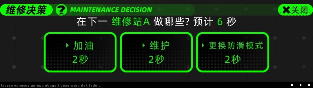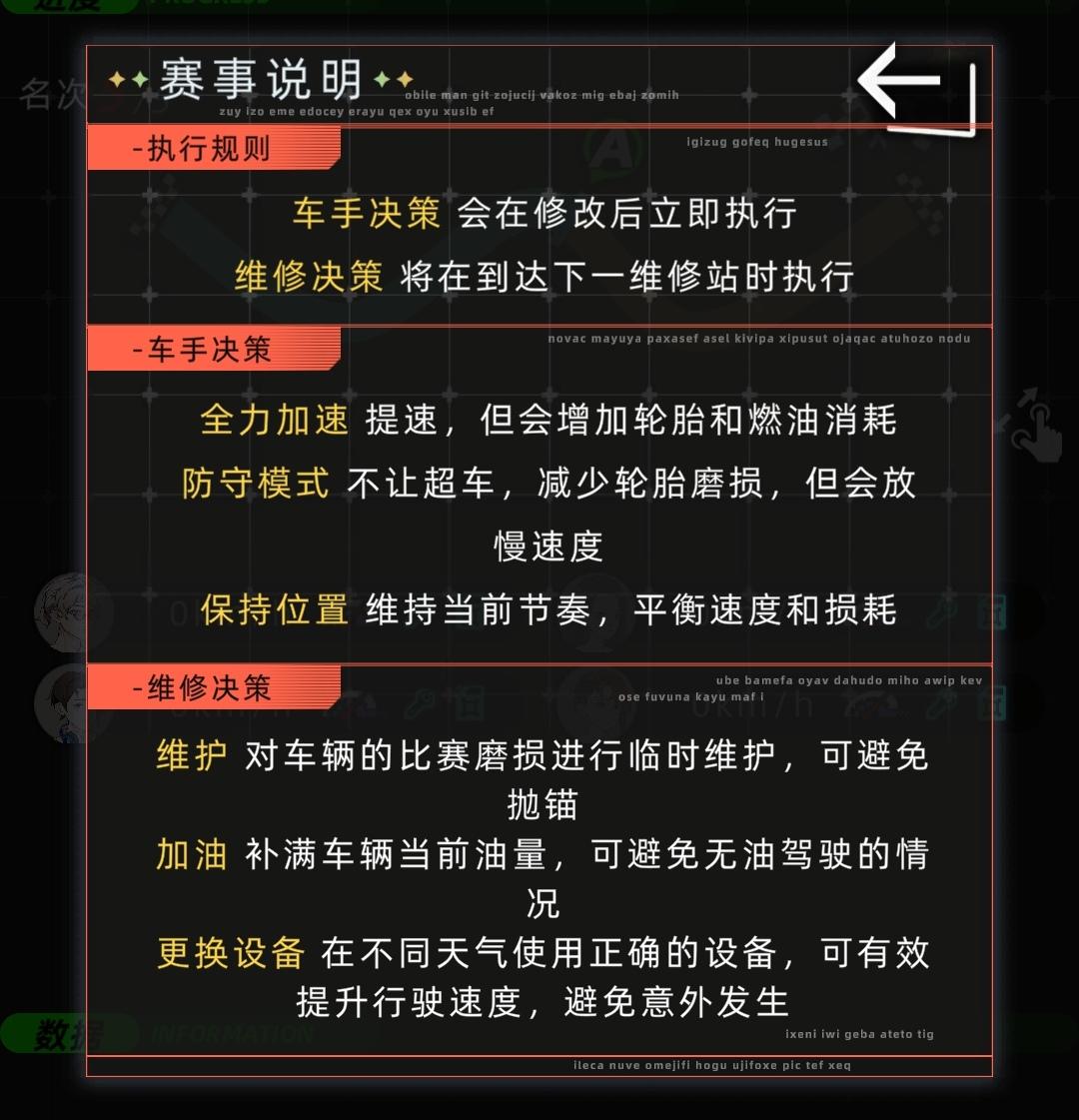 前期如果油量不够就选赛车手节能模式,维修站选择加油➕维修,注意天气变化,后期只需要加速模式,中间维修站加油➕维修,一辆好车,把图纸研究完的插件装上【我看谁还不知道维修决策都可以都选,可以单选或者不选】