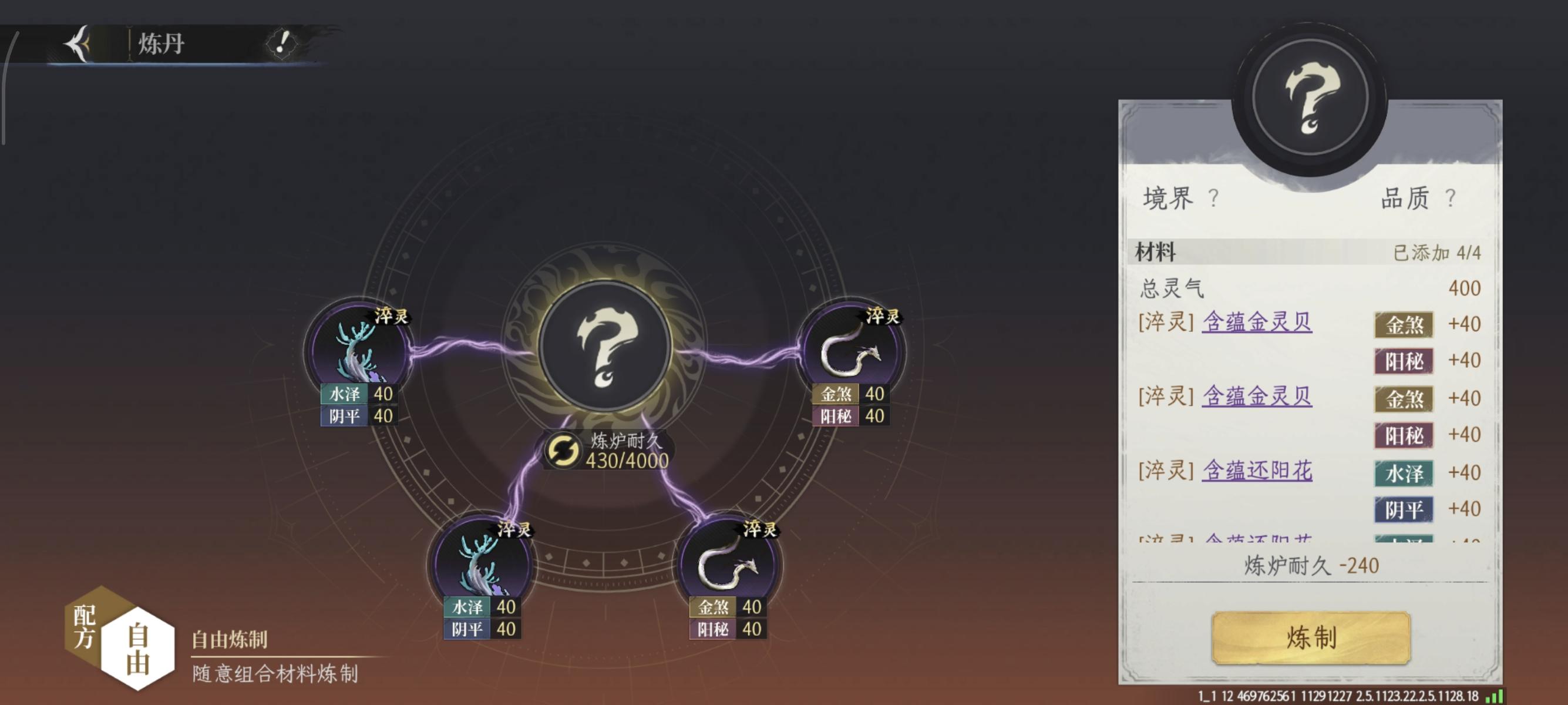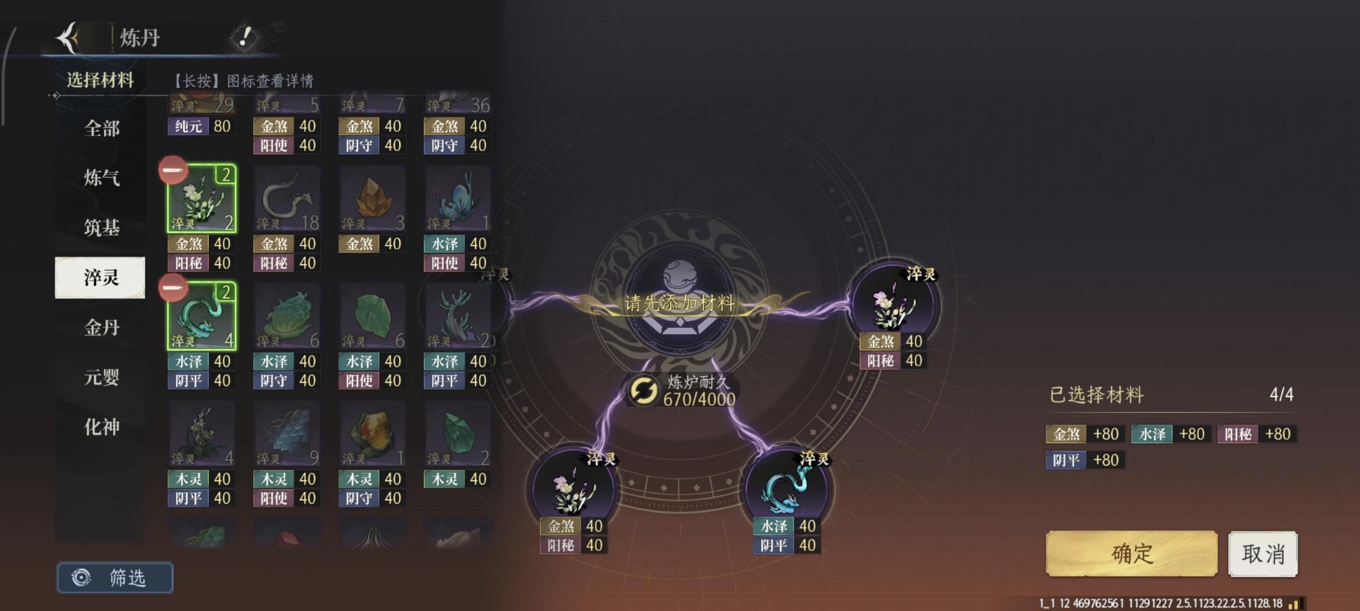昨天我的攻略里讲了,五行会影响丹药的效果,在练金丹时,额外有一个条件,那就是一定是两个元素都有,且两个元素的含量相同,比如你加了80金,那就也要加80土。