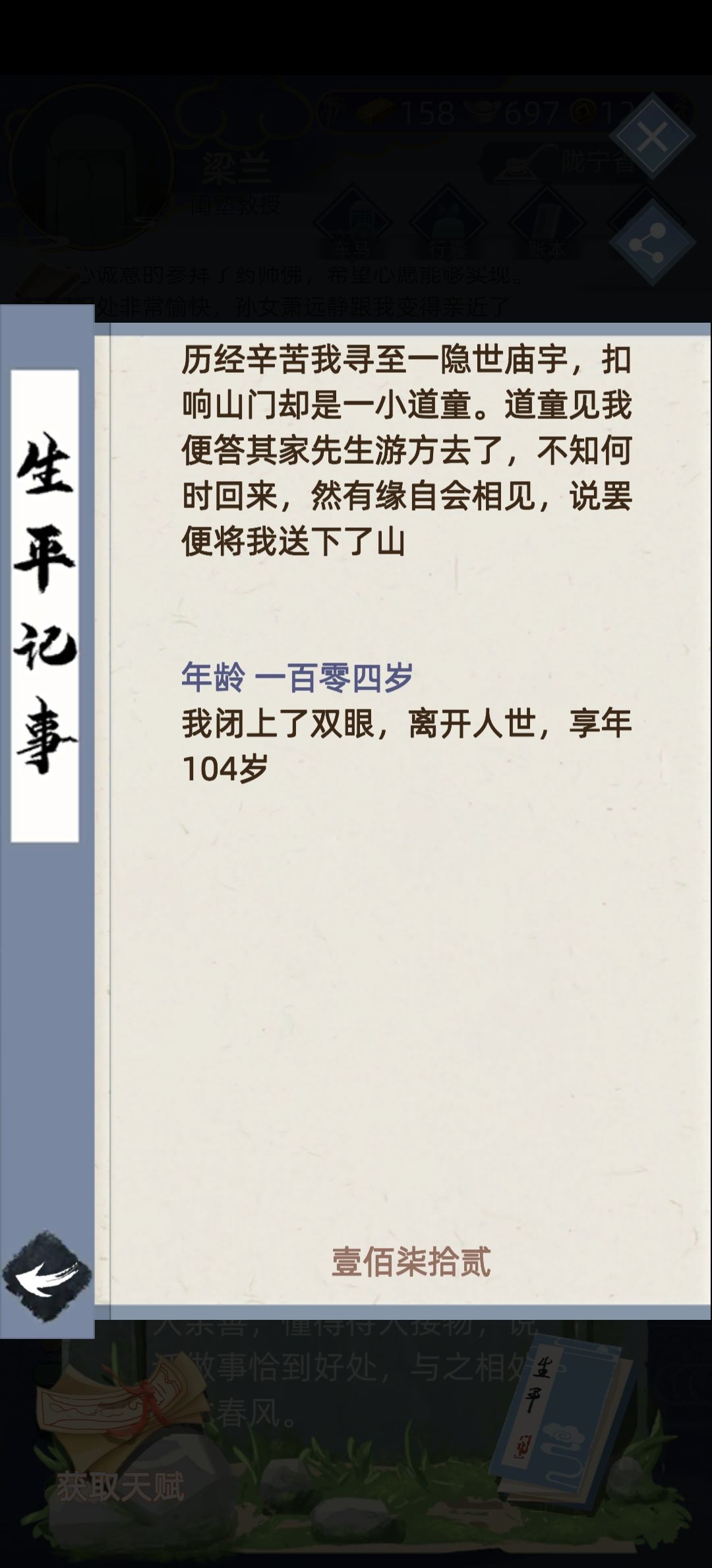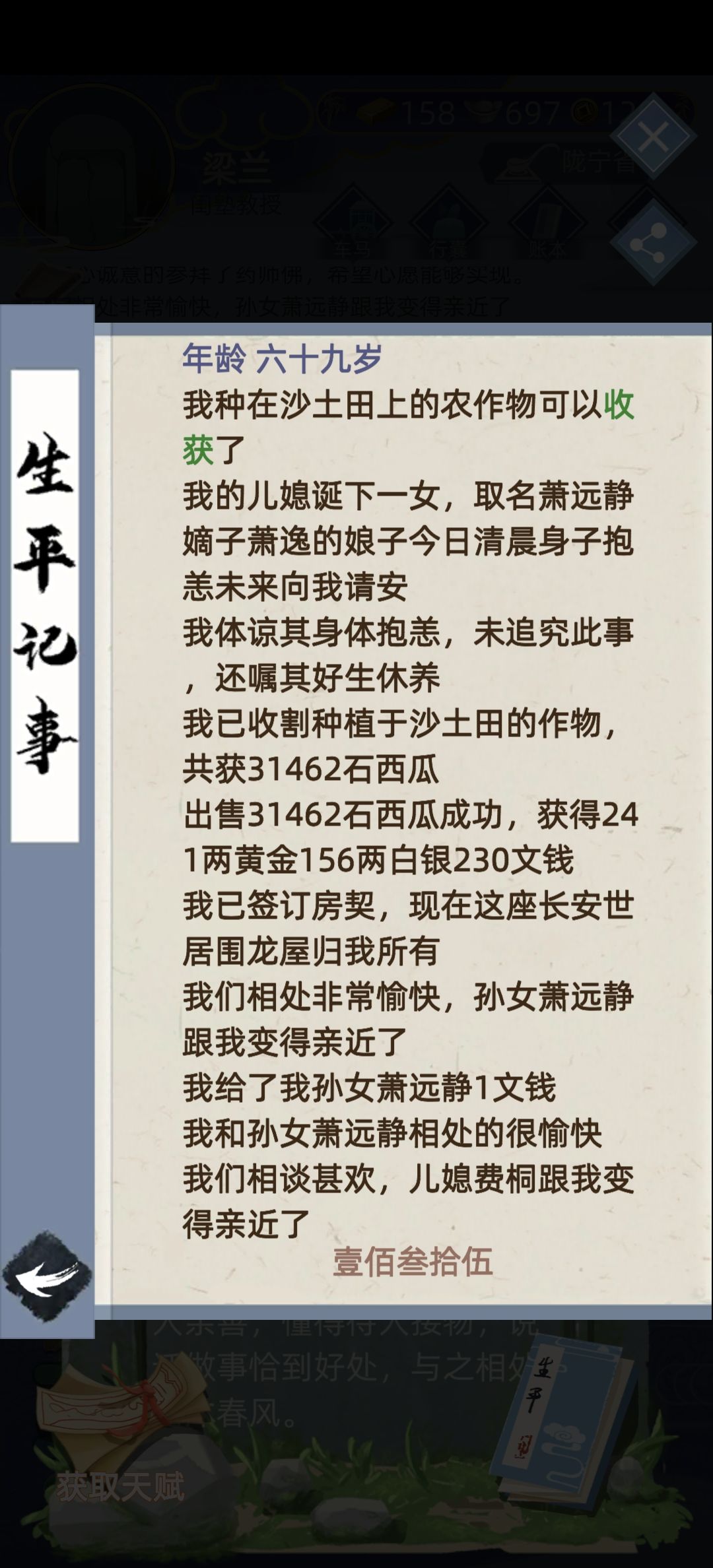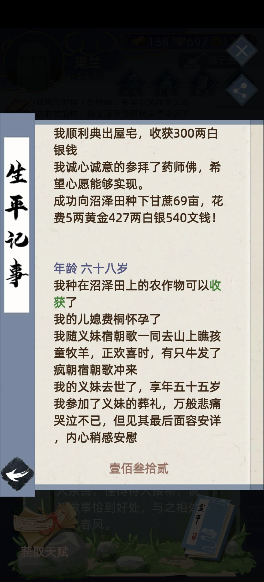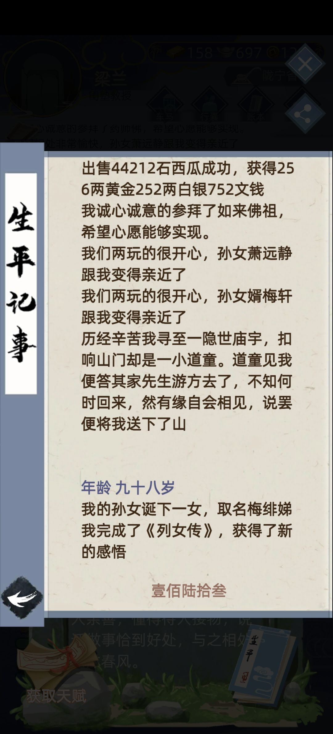 这个角色我就一直佛系玩,每年都以为要去世了,结果把丈夫熬没了,二儿子早逝,大儿子儿媳也早逝,孙女嫁了个超级丑的孙女婿还生了个女孩……终于在104岁寿终正寝了。