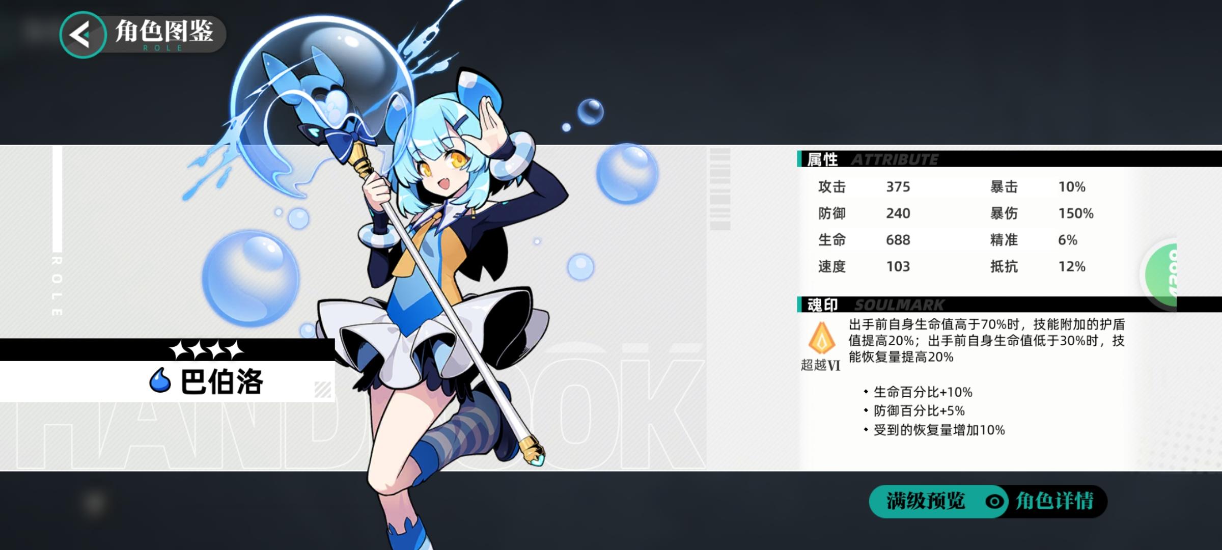 巴伯洛:这个角色强在群体免控很实用以及她的大招奶量很足,双奶情况下如果觉得缺加攻buff就给她带个换外套,同时作为四星奶妈相当经济实惠,能和青龙一起循环免弱真的很好用啊