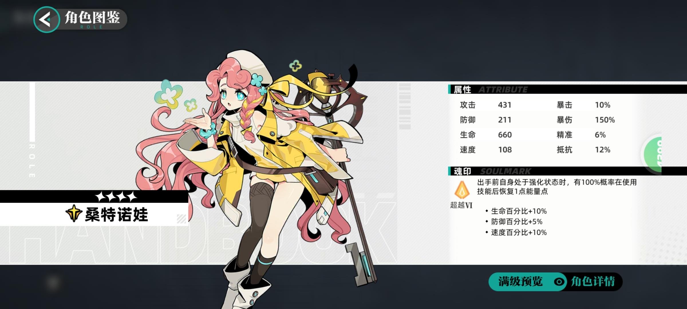 桑特诺娃:在前期暴击力不足的时候可以当做暴击拐来提升队伍的输出,同时她二技能还能单体上免弱和加攻,自身在魂印回应的情况下回奶频率会很高。同时作为四星奶妈经济实惠