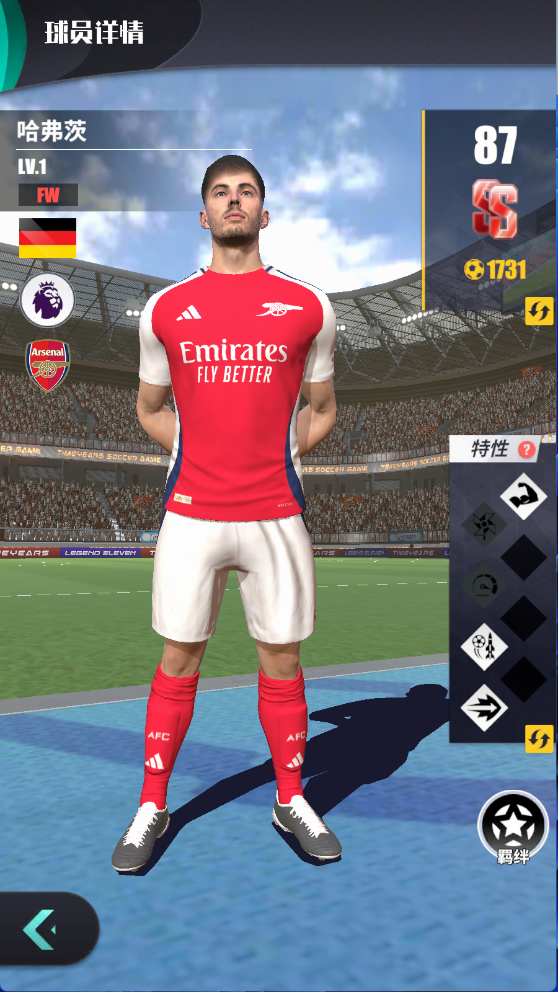 其次是哈弗茨,在游戏中评分87。其球员特性包括:精准制导,蓄势重击等技能。精准指导是球员擅长通过预判守门员重心与球门死角分布,在射门前完成轨迹校准,如同导弹锁定目标般精准打击,使射门成功率提高1.0%。蓄势重击是指球员有顽强的心境,射失时迅速调整心态,蓄势等待合适时机,必将给予对手重击。射门失败后,射门与凌空属性提高3%。哈弗茨在阿森纳阵中是十分关键的角色,无论是出色的组织能力,还是精准的射门能力,都给阿森纳带来了巨大的帮助。