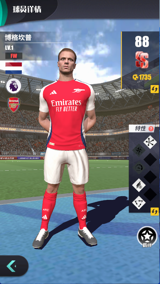 下面给玩家带来几个游戏中阿森纳球员的球员简单介绍:首先是博格坎普。在游戏中评分为88分,其球员特性包括:抗压控球,控场布局,鬼魅切位等特性。抗压控球是指球员降低重心构筑三角护球区,通过身体卡位与初秋频率控制形成绝对保护区,控球成功率提高1.0%。控场布局是指球员针对对手开场阵型松散的特点,通过高频率短传渗透建立控球优势。前几分钟,传球与控球属性提高3.0%。每个特性在球员升到一定等级后会增加属性。