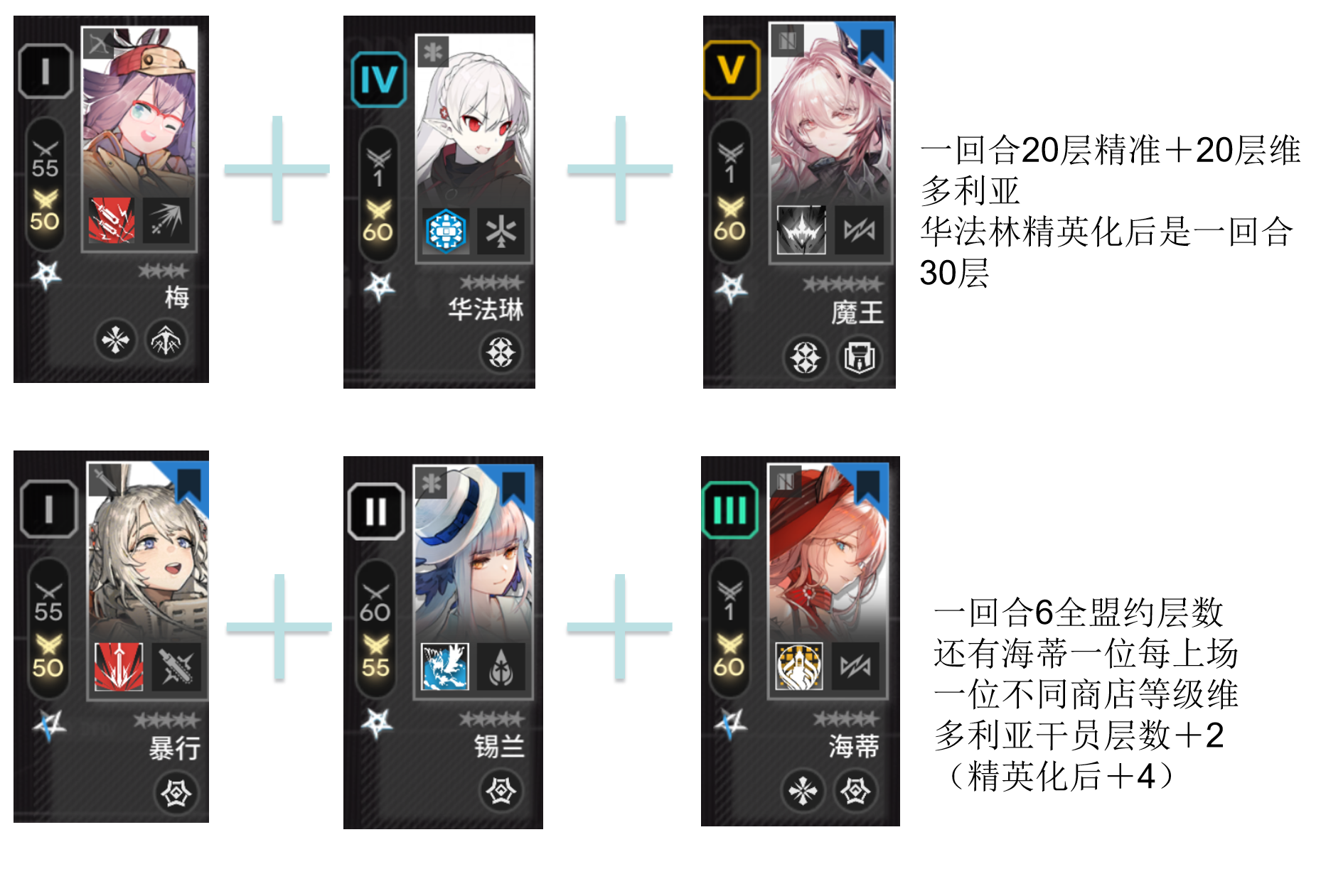 看到角色费用等级其实就可以知道维多利亚前中期的叠层方式与中后期叠层方式的区别了,当然这只是很常规的叠层。实际游玩的话吃到灵巧或者攻速锤攻速加成的风笛(记得带2)在面对锅碗瓢盆时也能叠不少层数,以及会用梅+寒克叠层,问我为什么不用维娜叠层那我只能告诉你维纳是区(维多利亚很长一段时间内都待在4本,维纳作为一个六费卡在海蒂和塞雷娅加强后没有抓她的理由)。