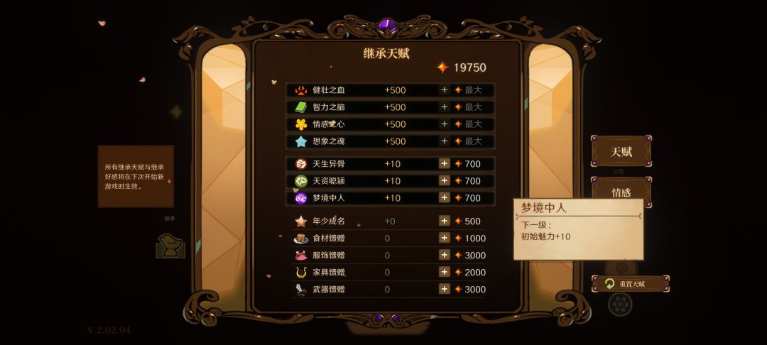 天赋选择:智力侧土地馈赠,美食馈赠,精力充沛,农神祝福,社交侧兢兢业业,甜言蜜语,如沐春风。剩下的可点可不点。