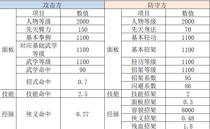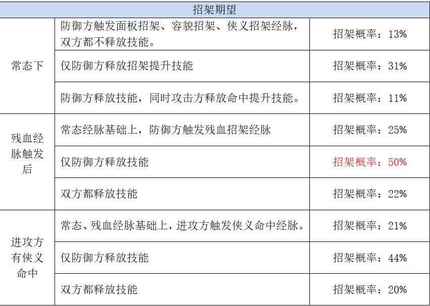 ③经脉,攻击方考虑携带强化命中的经脉1个,其触发条件与侠义值有关,简称侠义命中;防御方考虑携带强化招架的经脉5个,分别与面板、容貌、侠义值、血线有关,简称为面板招架、容貌招架、侠义招架、残血招架。