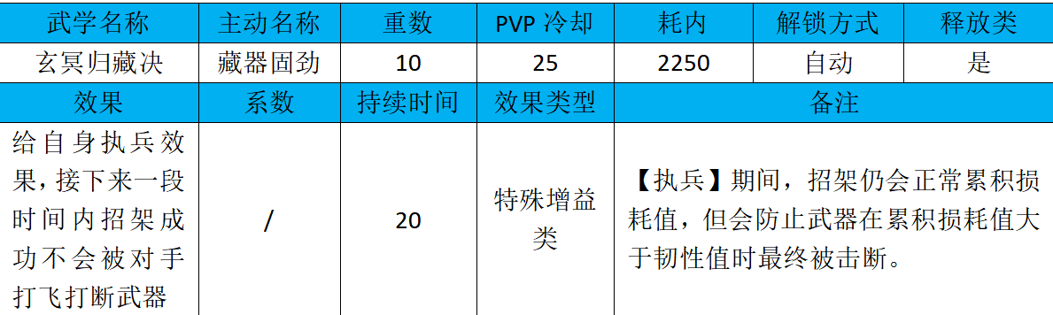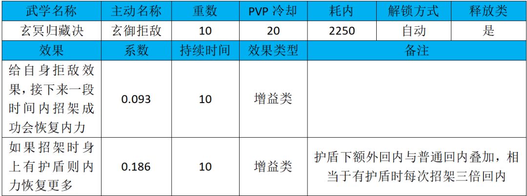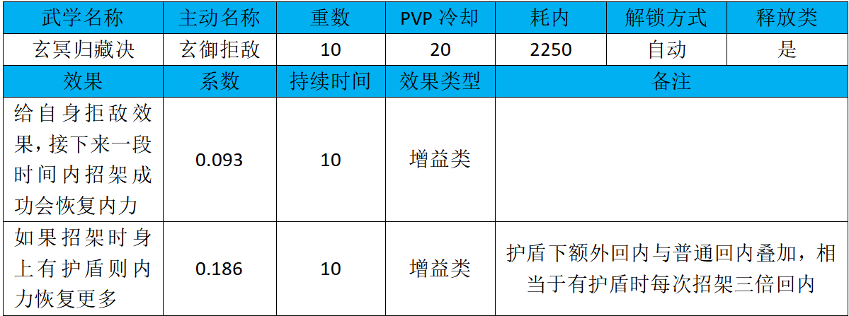 机制上,玄冥归藏决可以说是血煞狂刀的官配内功,技能“玄御拒敌”有招架回内效果,很契合血煞狂刀的高招架系数,理想情况是通过高频招架拉开内力差,从而在对局末期打出高额换血伤害。