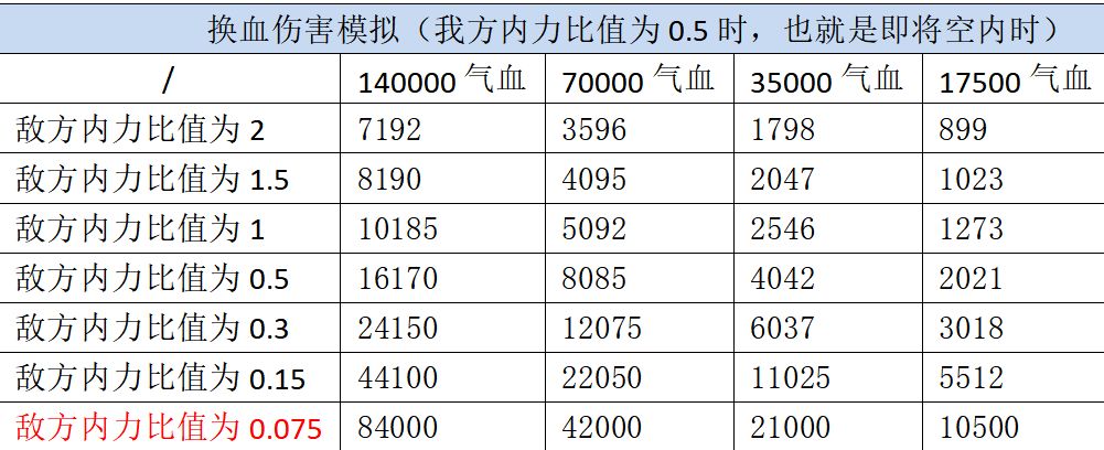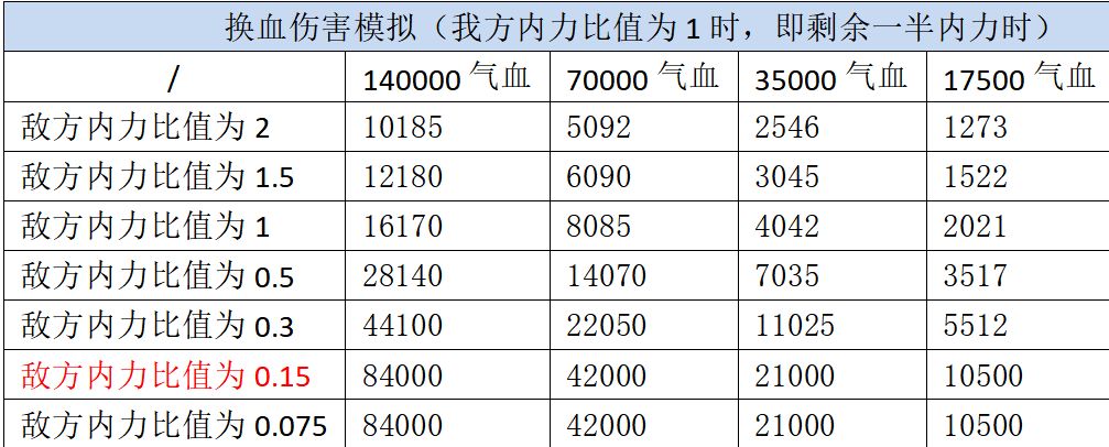 ②敌方内力比值低于1后,换血伤害开始大幅提升,最高可达8.4万的伤害上限。所以要提升伤害,就要拉开内力差。