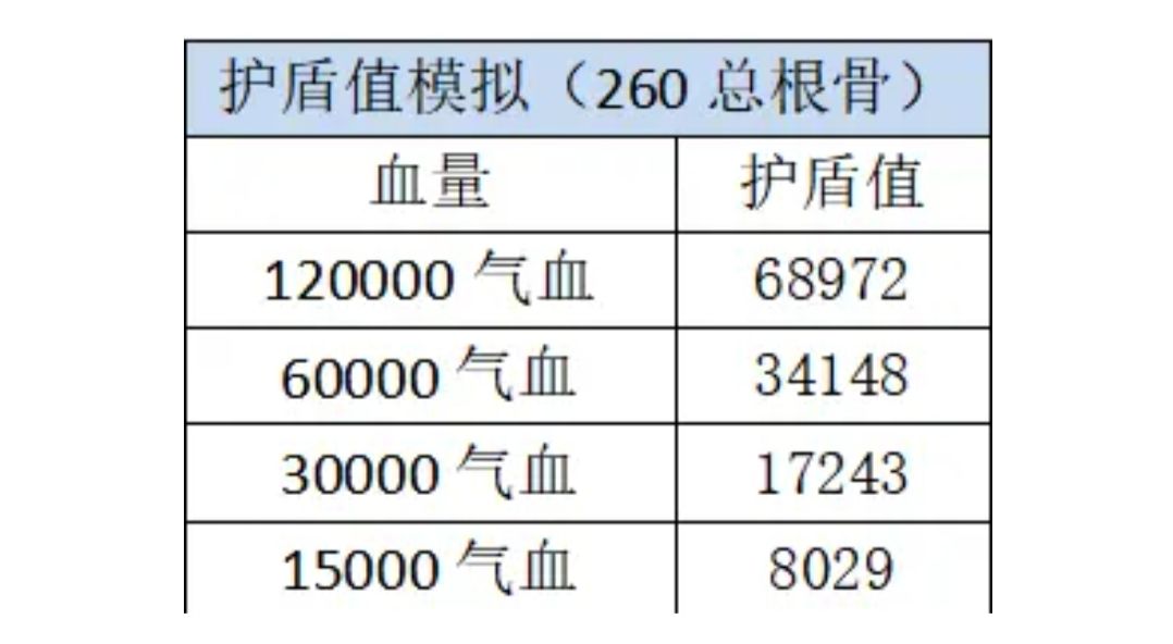 根据技能公式,该护盾的盾量是动态的,主要取决于释放技能时的血量。以总根骨260点(先天+后天)进行模拟,可以看出盾量大致是随血量减少呈线性衰减的,如果在血量很低时释放技能,护盾会比较脆弱,所以在对局末期相对乏力。