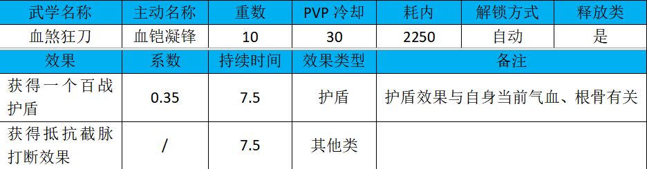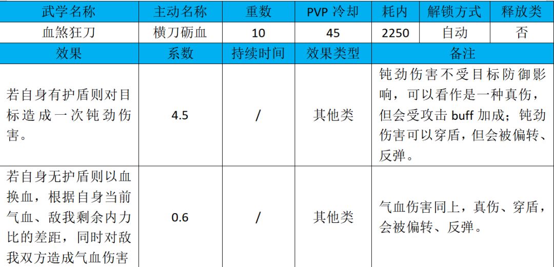 技能简评:纯粹的招架回内技能,有护盾时回内更多,可以与血煞狂刀的护盾技能产生联动。无护盾时系数相对较低(同类技能“复苏之风”招架回内系数为0.207,崆峒“天地五转”系数为0.19),有护盾时每次招架约回复1200内力,十重技能消耗2250内力,则需两次招架才能回本。