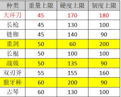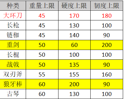先说击飞,能否被击飞取决于武器的重量。只有当我方武器重量小于敌方时,才有概率在招架时被击飞(敌方使用拳脚则不会被击飞)。假设我方使用45重大环刀,则理论上仅下表所列武器可能更重。而且主流神兵打造通常会为了神兵加速而控制重量,实战中能遇到足以击飞满重大环刀的武器,通常只有狼牙棒、重剑或战戟。