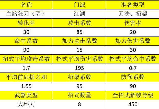 系数上,整体较为优秀,尤其是防御、招架系数很高,是目前环境下的顶级阴性招架。在秒伤模拟中,血煞狂刀的平砍高于七杀刀法(满重大环刀),但远低于风暴进行曲(加速短刀)。作为以技能伤害为主的武学,其平砍输出参考意义有限,不再赘述。