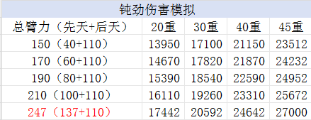 钝劲伤害模拟显示,臂力对钝劲伤害的增幅相对较小,总臂力247点(先天137+后天110)时达到最大伤害2.7万,而武器重量对钝劲伤害的增幅非常大,即使在高根骨、低臂力加点下,仍可轻松打出超过2万的爆发伤害。