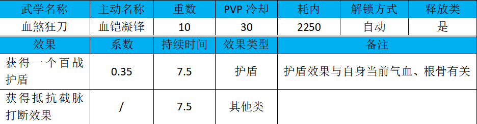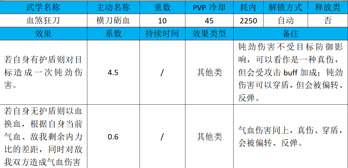 血煞狂刀的短板在于主动技能冷却时间过长。十重技能下,两个技能的冷却分别为30秒与45秒,远超当前主流武学。假设开局就释放血煞狂刀的第一套技能,不考虑触发“羚羊挂角”经脉(羚羊创造奇迹!),则第二套技能很可能会晚于对手,如果先一步被对手的第二套技能灌伤,将极大削弱第二个“横刀砺血”的换血斩杀能力。