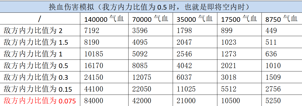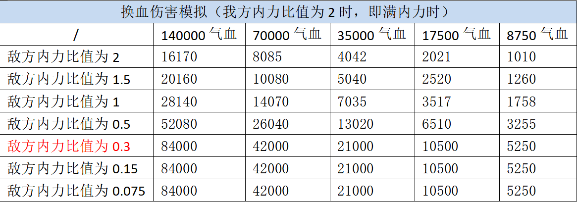 第二,无护盾时以血换血,对敌我双方同时造成真实气血伤害。伤害量基于自身当前血量及敌我双方的“内力比值”(指当前内力值÷内力上限,最高为2)。通过模拟我方内力比值分别为2、1、0.5时的伤害变化,可以看出: