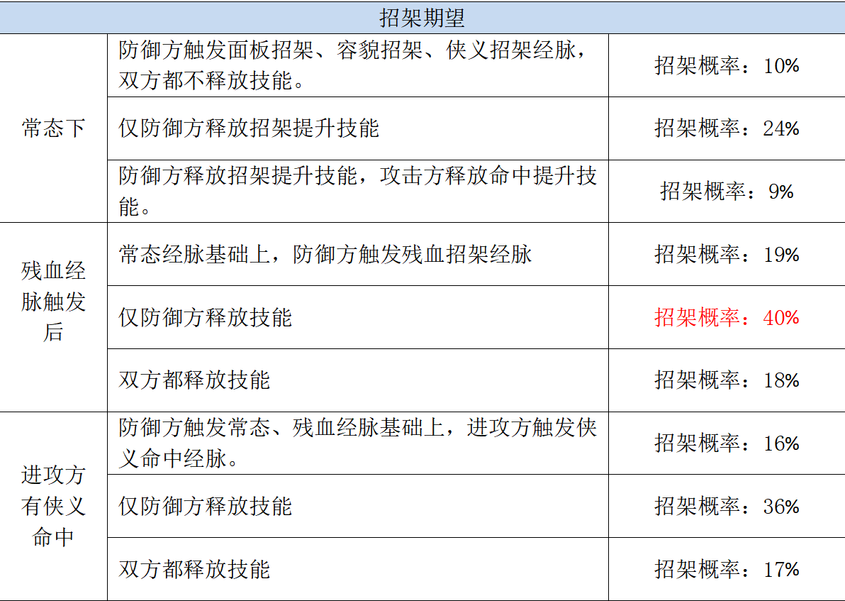 可以看出,常态下的招架期望仅有10%,残血状态下招架期望来到19%,残血并释放技能时招架期望达到最高值40%。如果对手触发了侠义命中经脉,会小幅削弱我方招架率,而如果对手拥有命中增益技能,将大幅削弱我方招架率。