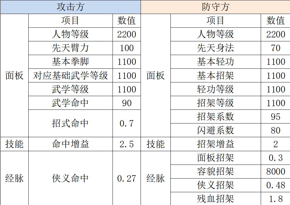 ③经脉,攻击方考虑携带强化命中的经脉1个,其触发条件与侠义值有关,简称侠义命中;防御方考虑携带强化招架的经脉5个,增益效果或触发条件分别与面板、容貌、侠义值、血线有关,以下简称为面板招架、容貌招架、侠义招架、残血招架。