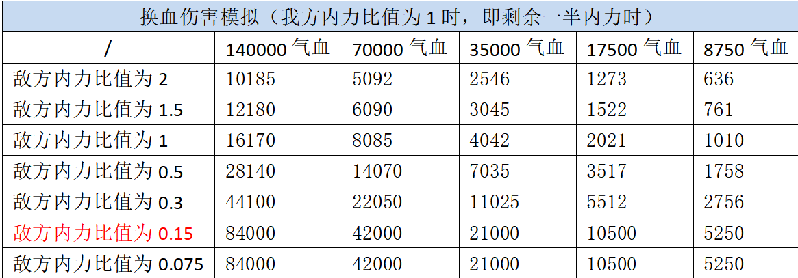 ③我方内力比值越高,达到伤害上限所需的敌方内力比值条件越宽松,即我方内力越充沛,越容易打出上限伤害。