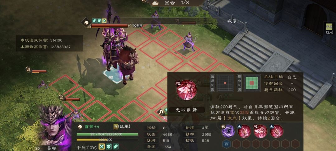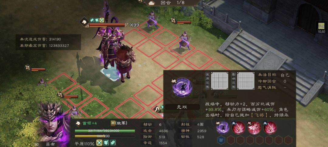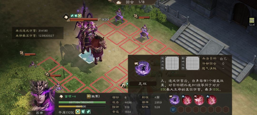 首先是天赋,额外多了2点移动,直接摁死了靠移动力差打伤害的武将,同时天赋减伤降低到60%,但是飞将buff会每回合给自己施加3级减伤,即40%减伤效果,因此驱散就变得格外重要,同时追伤改为最多15%,但是技能段数变多了,并且飞将算固有buff,也就是说吕布出手必定能带走5x%的真伤