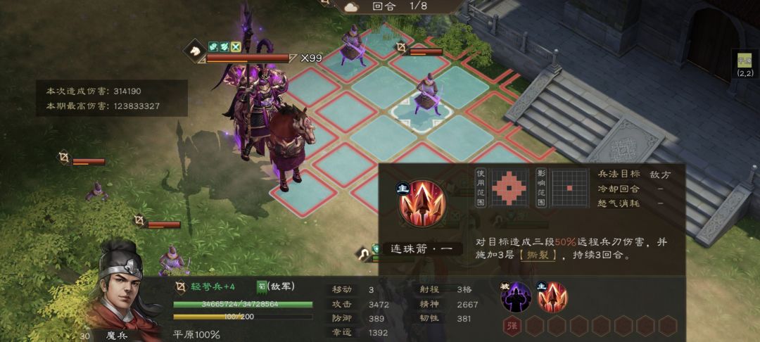 同时还有4个弩兵,3格射程,天赋自带90%减伤和百分比抗性,同时技能可以打1-3格,造成3层撕裂效果,配合吕布技能,一旦中撕裂=必死,同时血量非常厚,几乎无法击杀,因此怎么打就很有讲究了-_-