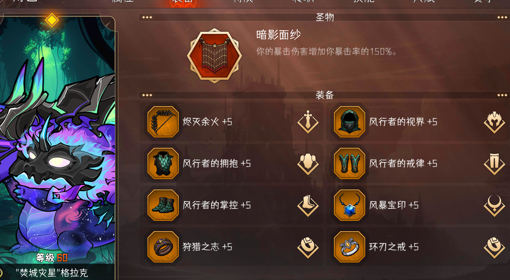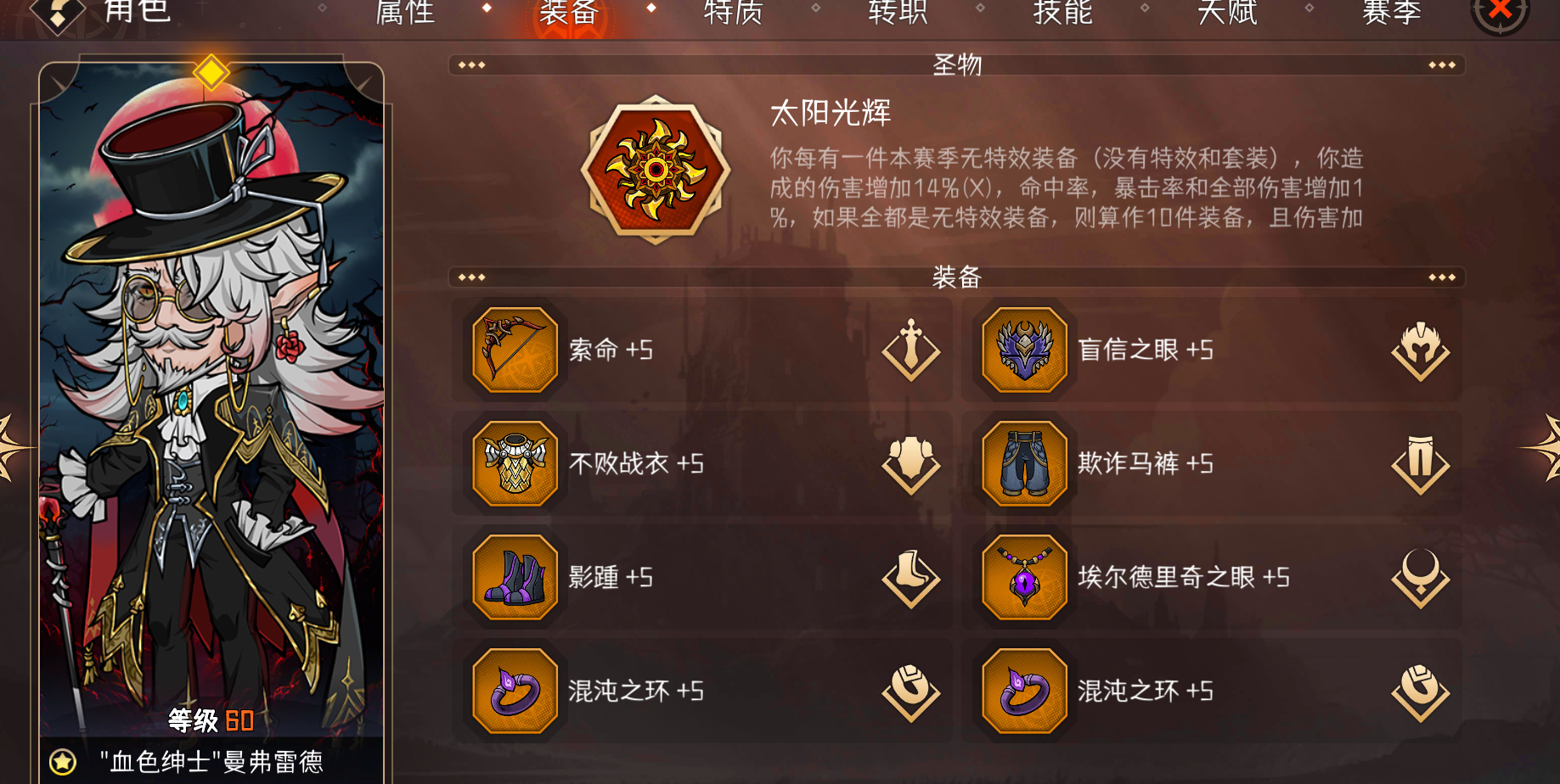 虽然是满命,但我装备是真的一件没刷,完全拿到的第一件凑了一套就拿来用了,所以属性可能和大家低命的也差不太多。穿刺人下人,所以转了劈砍,带面纱圣物。