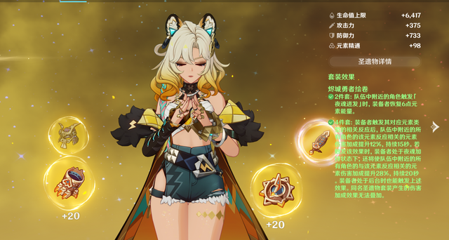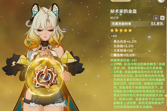 咱们在养成的时候,完全可以抓大放小,随便带个纳塔户口辅助专属圣遗物,——勇者套,只需要主词条合理,用充、防、防,或者防、防、防,都可以。