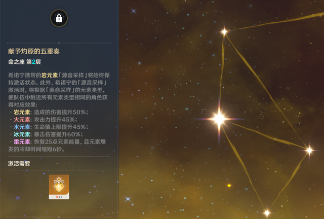 当然,如果你有条件,还抽到希诺宁的2命,那么,希诺宁的减抗,不仅能再加个岩元素,而且,还能为队友提供对应元素的增益。