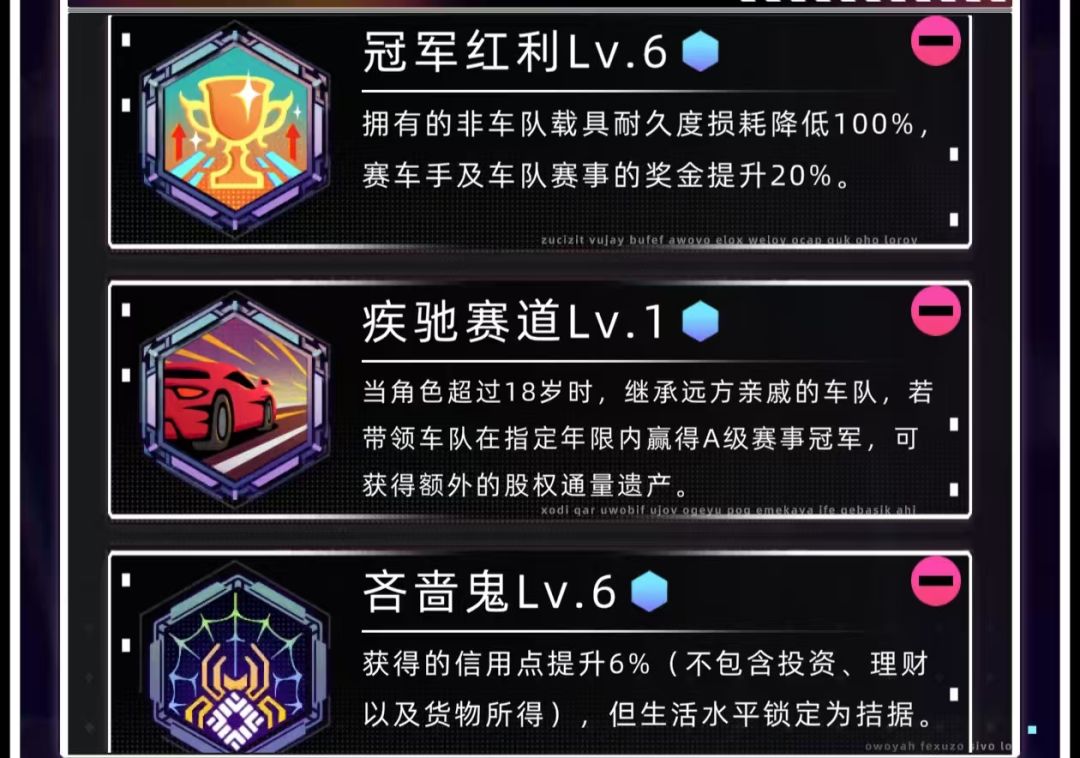 冠军红利(1格)+疾驰赛道(1格)+吝啬鬼(1格)+其他