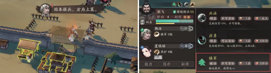 张飞与牵招追击触发蛮容易的,韩浩镇军的层数叠的还是蛮快的,也不容易掉,这两名武将相对来说比部分高CD的AOE物攻角色更适合携带韩浩。如果你的韩浩还在一些物理AOE角色身上,不如试试换给张飞或牵招~