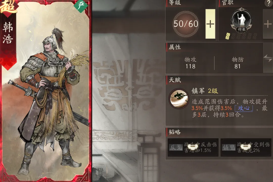 副将韩浩好胸弟们都知道吧?造成范围伤害后,可以给角色提供3.5%的物攻和攻心效果,最高可以叠满3层、共计10.5%的物攻和攻心效果。