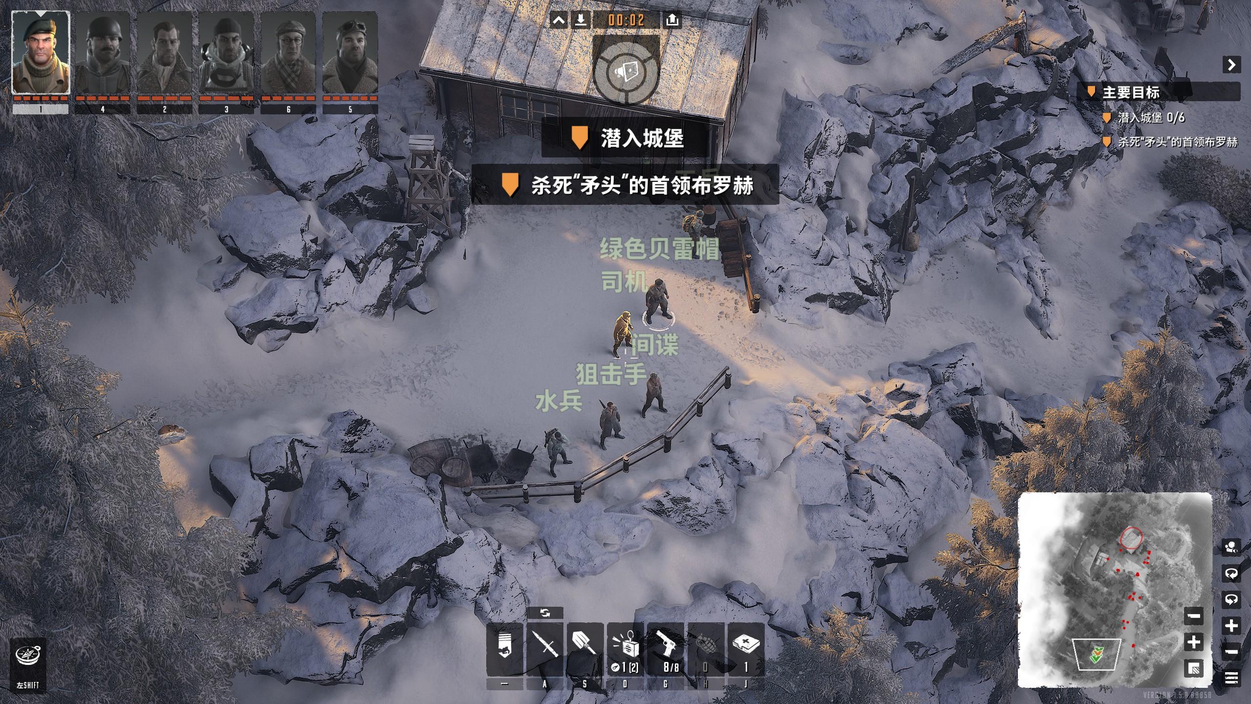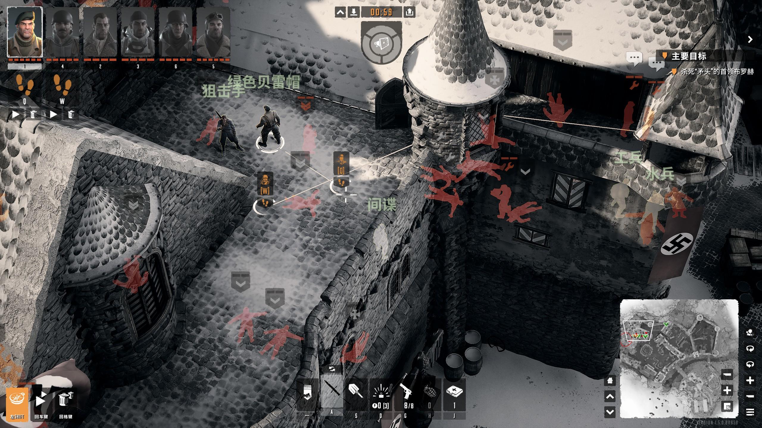 本作取消了盟军敢死队经典的背包系统,即通过杀死敌人获得背包里的道具然后运用到战场上,有着更高的战术自由度;本作反而强化了小队成员的个人技能,风格更偏向MIMIMI的几款游戏,比如狙击手和水鬼两个强力角色,不仅攻击距离远,还能稳定击杀敌人不吸引仇恨,相比之下贝雷帽的技能就有些平平无奇了,不过藏到地下利用敌人的路线出其不意的袭击方式,也是很常用的和队友打配合的好技能。