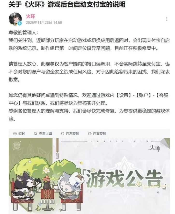 针对争议,《火环》官方当日发布公告回应,确认该现象是客户端接口误调用导致的异常。官方强调,游戏不会实际跳转至支付宝,也不会对玩家账户与资金安全造成影响,目前制作组已在紧急修复,玩家下次启动游戏即可完成更新。