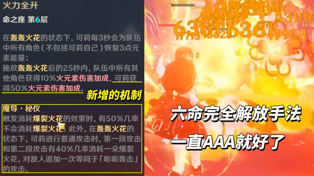 6命,元素爆发期间每3秒恢复队友3点能量,并且在25秒内队友获得10%火伤加成。新增“有50%概率不消耗爆裂火花。大招期间可莉获得50%火伤加成,且第1、2段普攻也有40%概率消耗爆裂火花追加特殊重击”。
