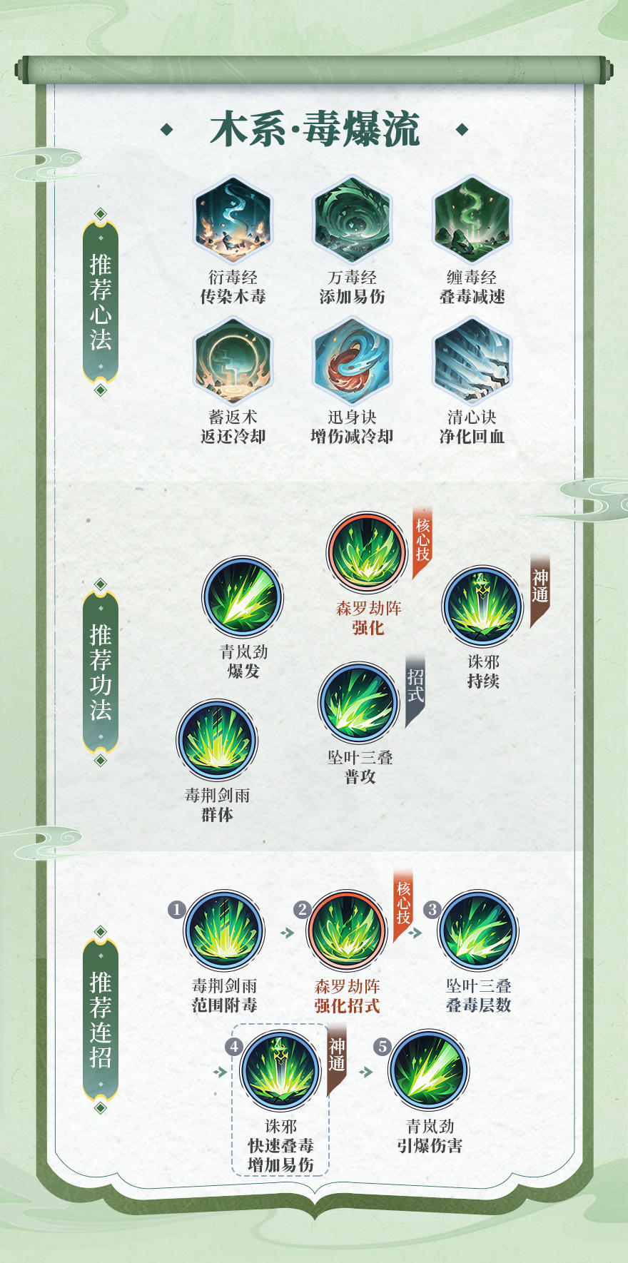木系 · 毒爆流:先叠后爆,清场效率高,适合中距离控场输出。