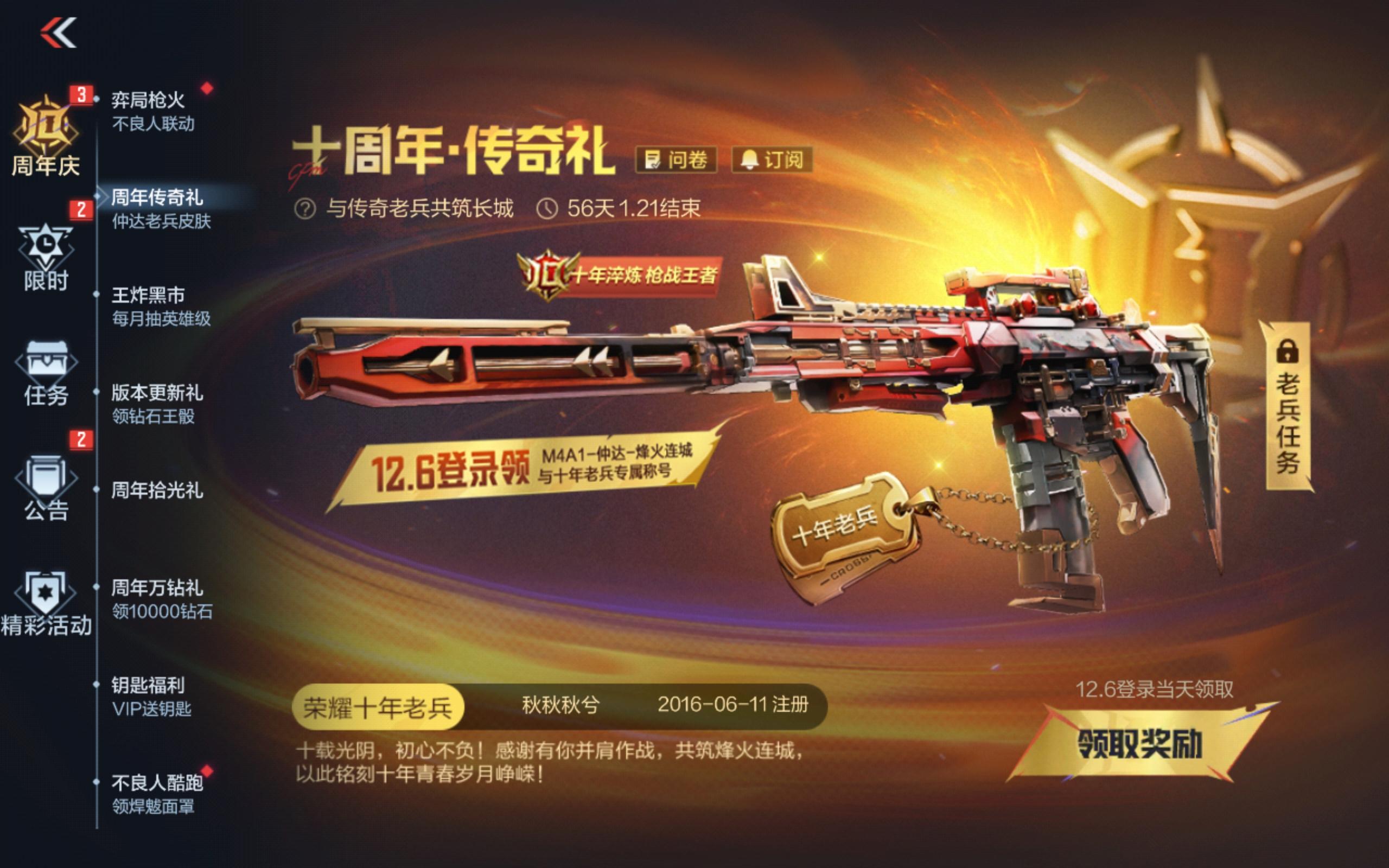 全体玩家将按注册时间获得荣耀十年老兵、传奇十年老兵、淬金枪战王者身份,全员均可免费领取感谢信与钻石,最高可狂揽10000钻福利!12月6日起,荣耀/传奇老兵登录游戏就能直接解锁【M4A1-仲达-烽火连城】皮肤与专属称号,淬金枪战王者需先绑定传奇老兵,且双方均登录后即可领取同款皮肤。12月6日更有专属老兵任务等你解锁!