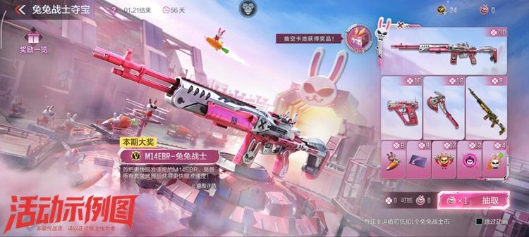兔兔战士夺宝重磅来袭!本次活动带来HD复刻武器套装兔兔战士系列武器——M14EBR-兔兔战士、USP-兔兔战士、手斧-兔兔战士,其中M14EBR-兔兔战士和USP-兔兔战士都拥有更快的瞄准速度,并且集齐套装以后还能额外拥有更快的瞄准速度,这波是把“快、准、萌”直接拉满!另外活动最多可抽取9次,抽满9次即可直接解锁“M14EBR-兔兔战士-现代战场”专属音效卡,还有该系列武器的配套万化道具等你来抽,解锁专属个性搭配!
