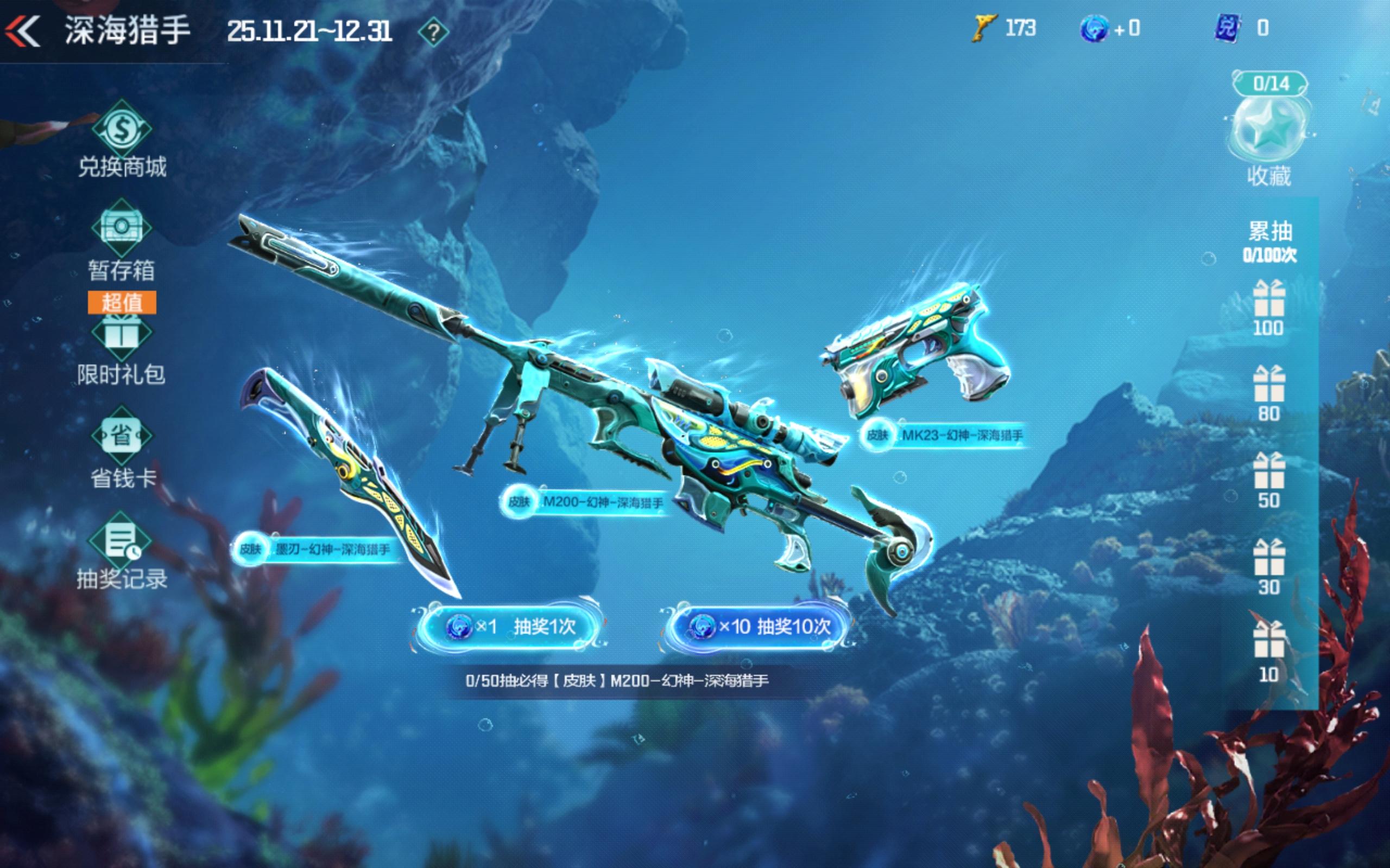 深海猎手夺宝来袭,参与抽奖,解锁深海主题的幻神系列限定皮肤——M200-幻神-深海猎手、鹰刃-幻神-深海猎手、MK23-幻神-深海猎手等。累计50抽必得【皮肤】M200-幻神-深海猎手,累抽10次、30次、50次等不同档位还能解锁额外奖励。另外还有98元的超值深海猎手夺宝助力礼包供大家选择,其中包含20抽奖币、2000赏金令积分以及1288钻石,也是相当划算!抽奖以及兑换获得14件指定道具,还将额外拿下最终消灭-深海猎手奖励!同时开放了兑换商城,等你兑换。快来把这套深海风格的外观收入囊中吧!