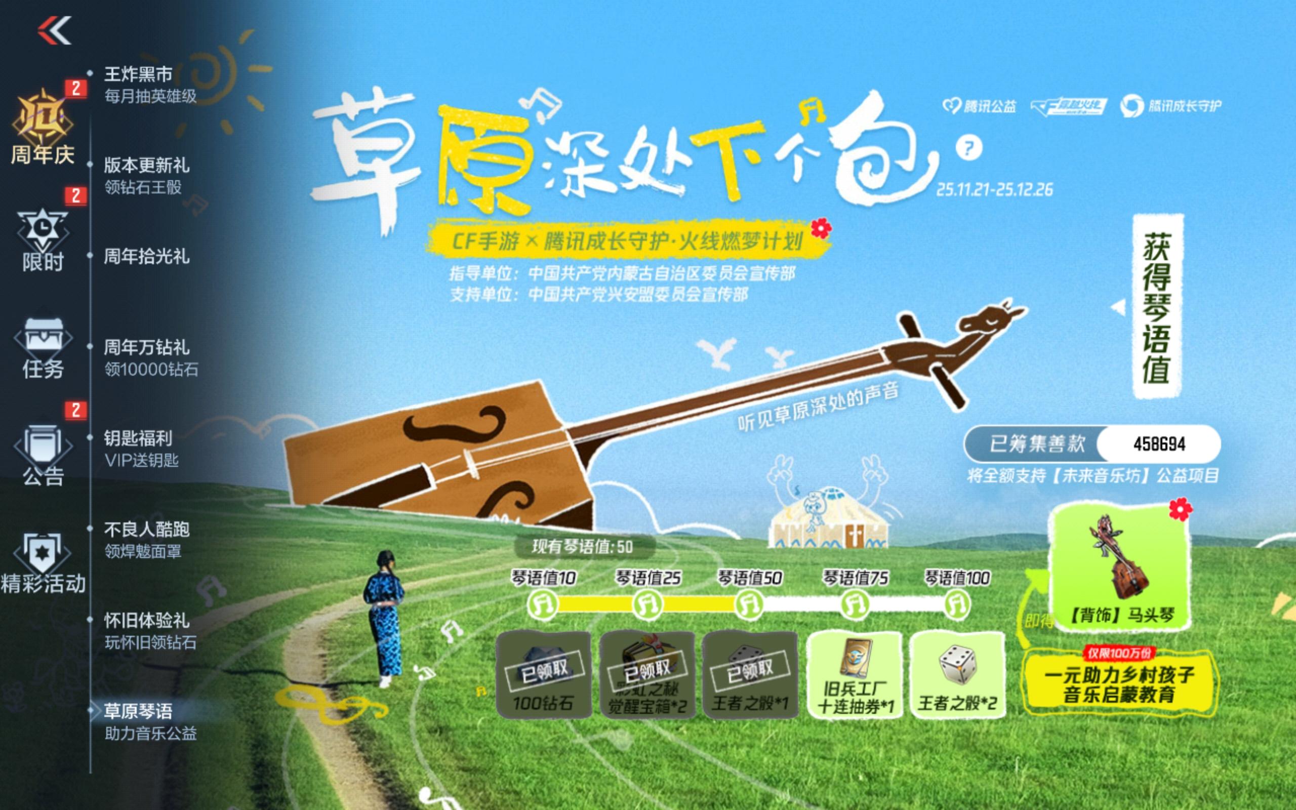 草原琴语公益活动正进行中,CF手游联动腾讯成长守护发起的“火线燃梦计划”,每天登录、参与对战就能攒“琴语值”,累计到10、25、50等指定档位,就能解锁100钻石、觉醒宝箱、王者之骰等奖励,达标即可直接领取对应福利;同时现在参与一元助力,不仅能为“未来音乐坊”公益项目捐出善款,还能获得限定【背包】马头琴~