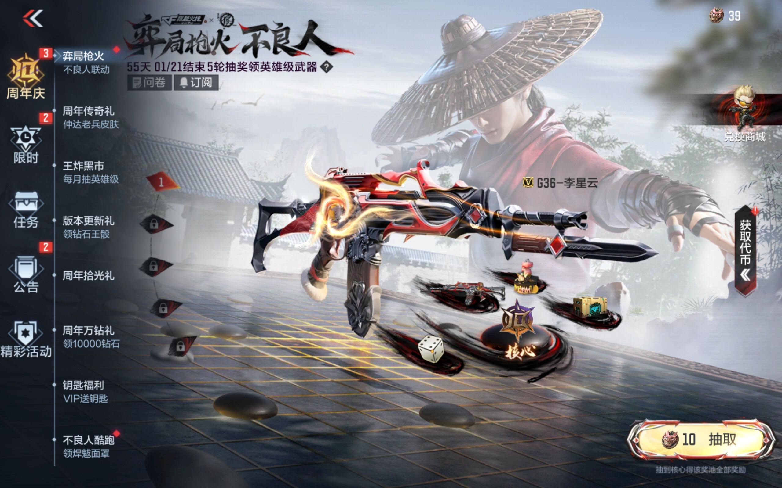 不良人联动重磅来袭!G36-李星云免费解锁,武器自带华阳针法技能、固定弹道特性与气经技能,战力拉满!参与日常任务与挑战任务即可赚取星云币,累计完成五轮抽奖,就能将联动武器等全部奖励收入囊中!更有十周年印花、纪念边框、限定挂饰、头饰蛋糕等十周年专属道具等你来拿!