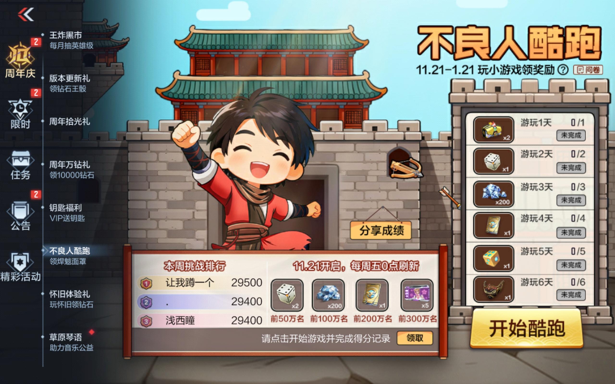 不良人酷跑活动正进行中!参与酷跑小游戏。每日游玩打卡,就能解锁王者之骰、钻石等福利!每周排行榜也已经开启啦,每周四会结算当期排名,前50万名起就能拿王者之骰、钻石等奖励,现在参与还能冲高分刷排名!