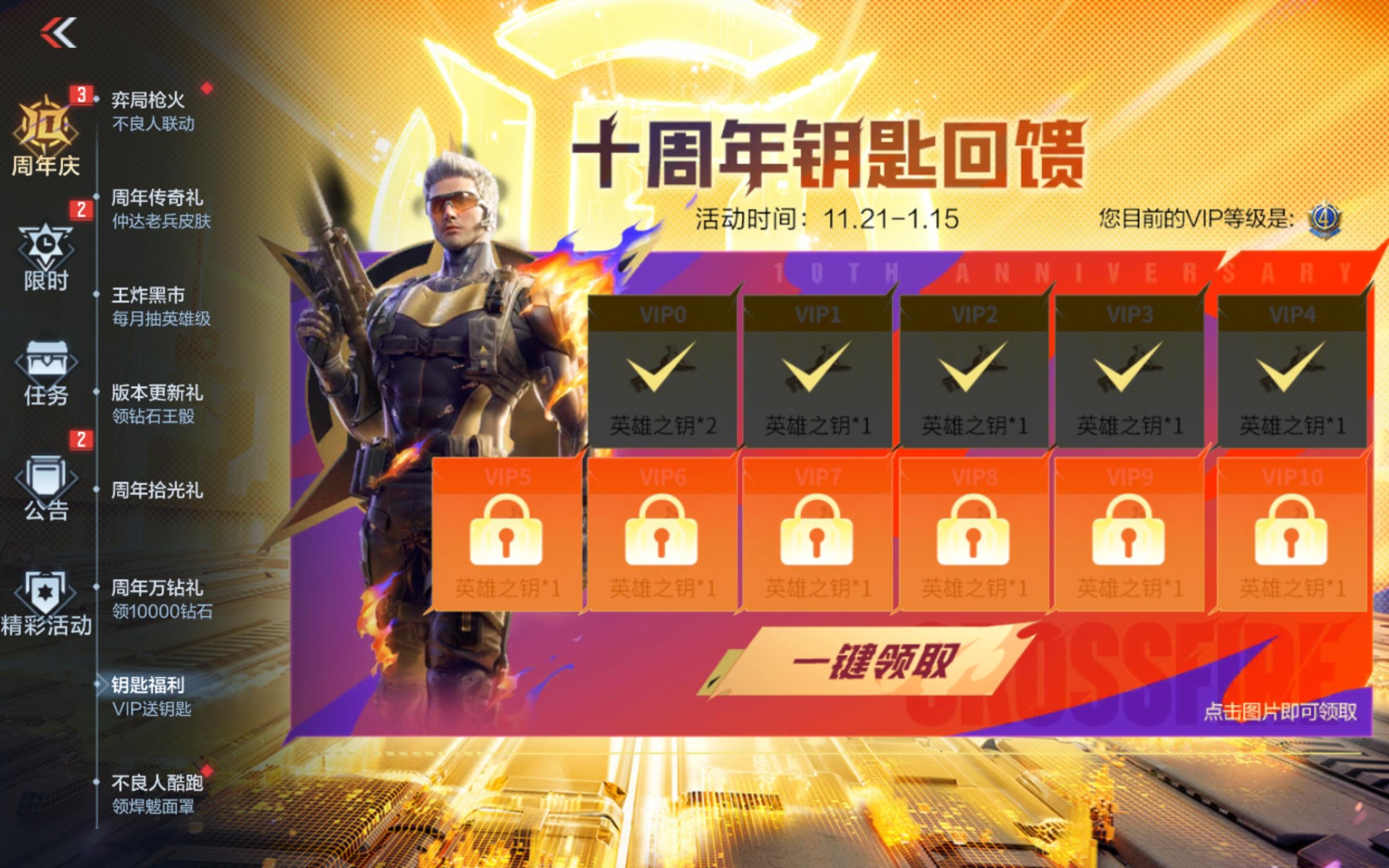 十周年英雄之钥回馈,根据VIP等级领取钥匙,即使VIP0也可以领取2把,往后VIP等级越高越增加一把,不用肝任务点“一键领取”就到账,这波周年福利不薅白不薅!