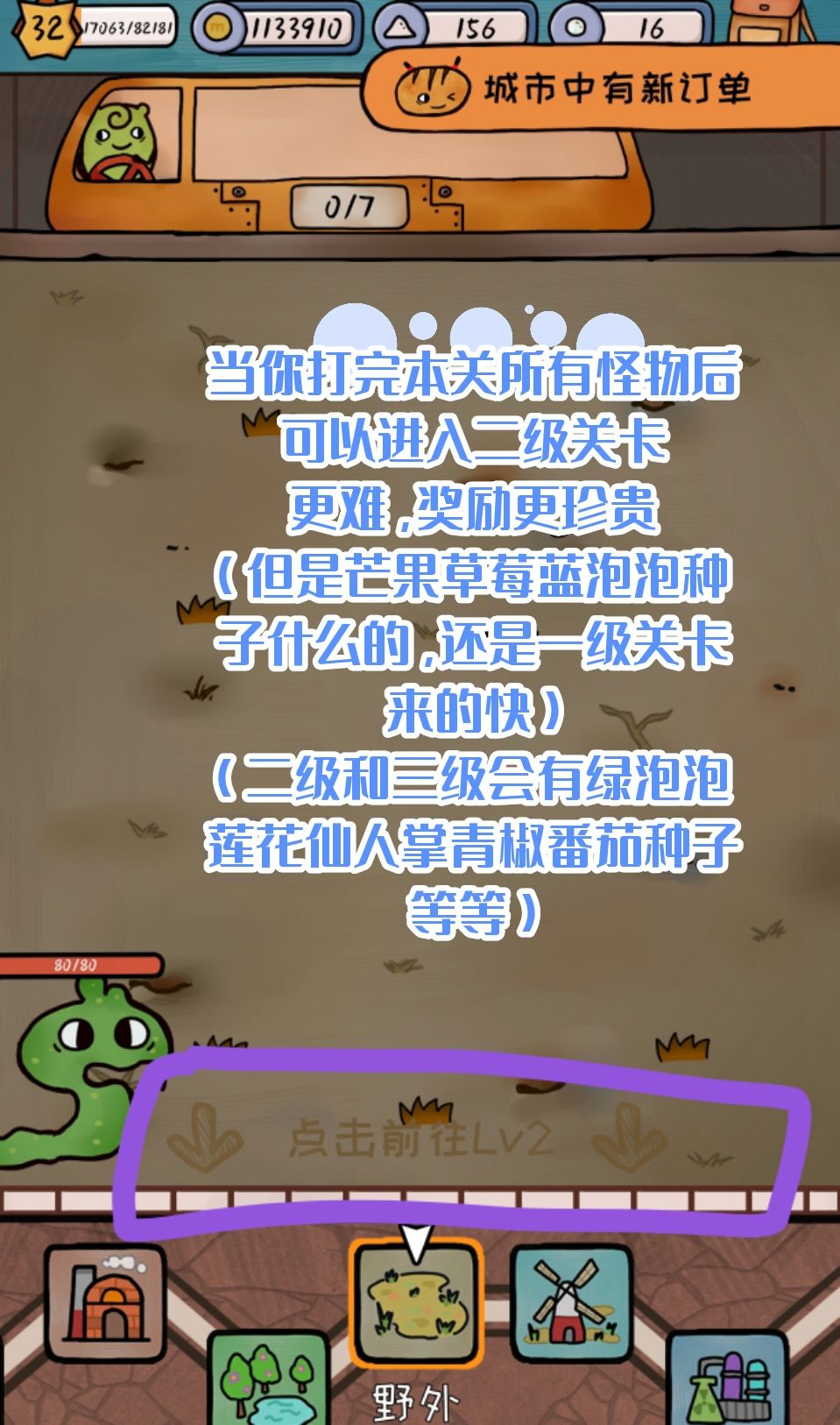 比较好玩的是,你通关后会有二级关卡,甚至有三级。难度依次上升,奖励的种类也各不相同(注意是不相同,比如芒果种子只能在1级关获得,二三级里根本没有)