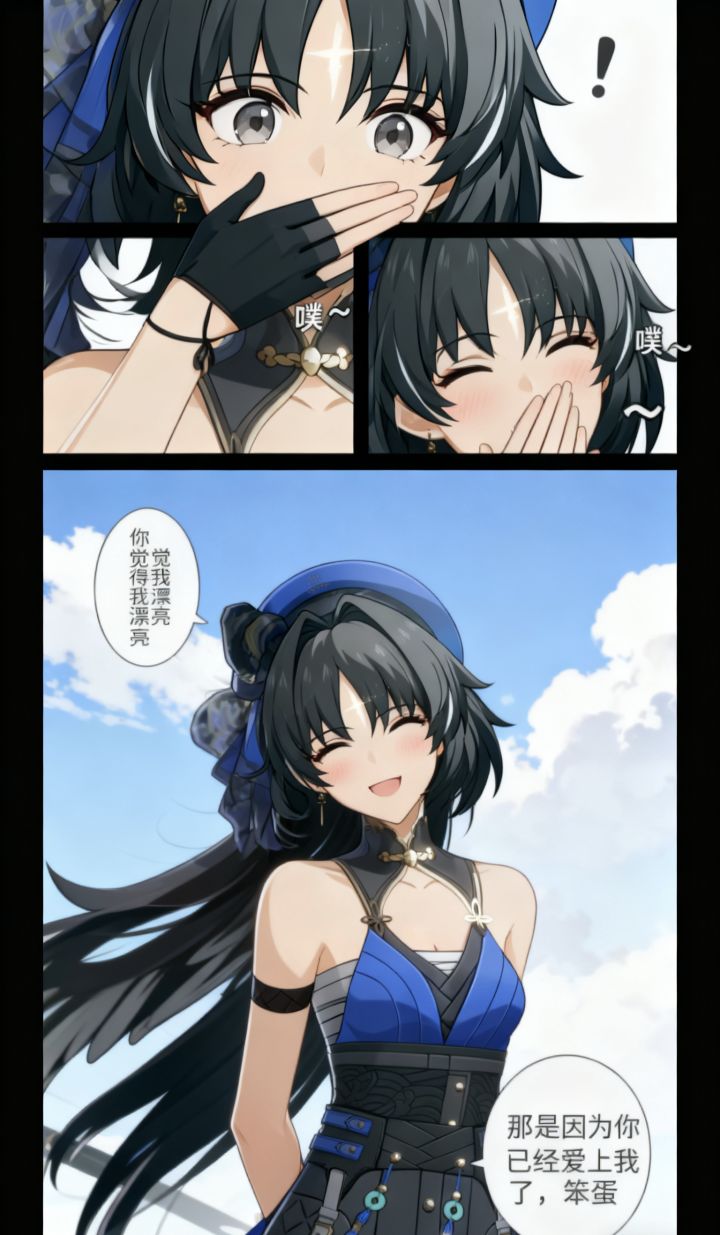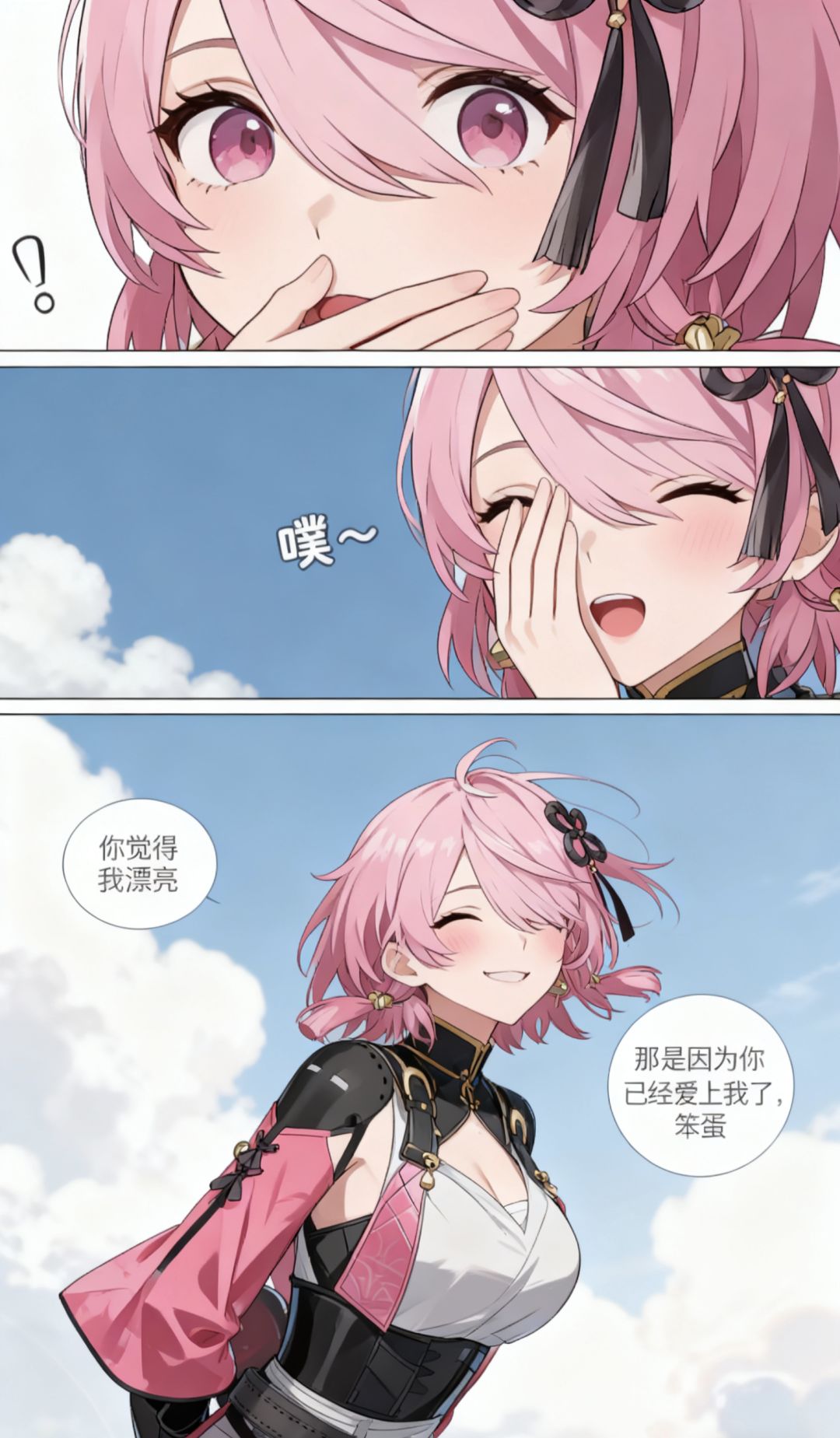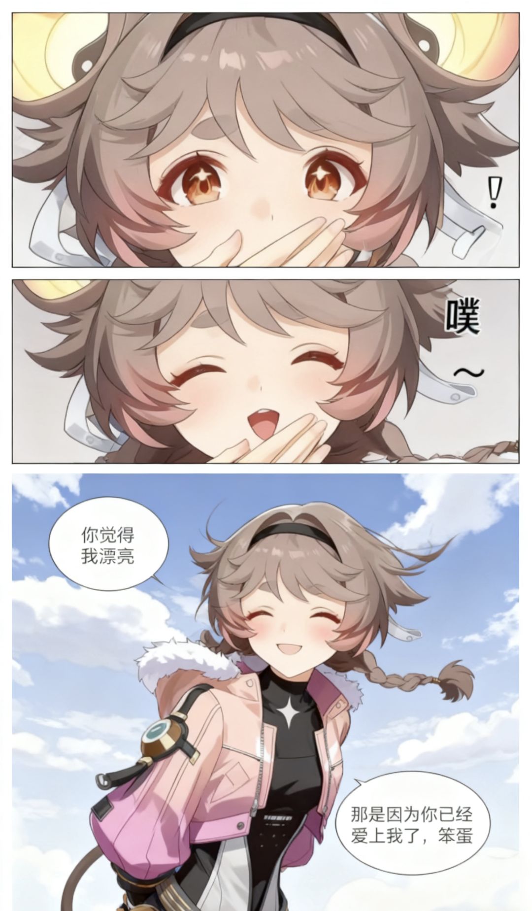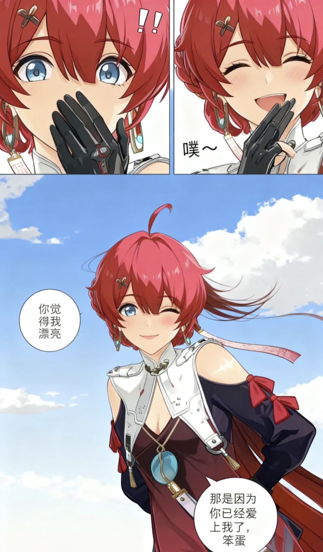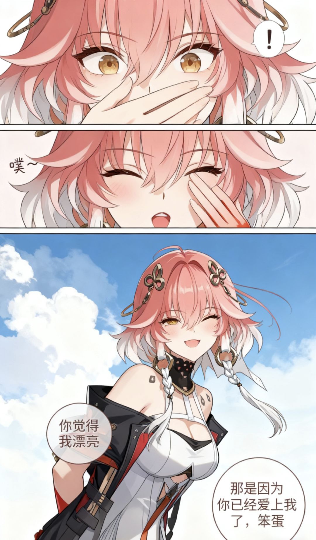 焚决:#鸣潮 #鸣潮创作激励 #鸣潮漂泊者 生成一张三格漫画,画面上方三分之一处的左半部分是第一格,右半部分是第二格,画面下方占总画面三分之二的位置是第三格。要求人物长相服装与参考图完全一致。第一格为人物的面部特写,眼睛睁大,眼神中带着一丝惊讶,嘴巴被一只手轻轻捂住,旁边配有一个 “!” 的符号,整体神态呈现出意外、略带羞怯的感觉,动作上是单手掩口,姿态显得较为娇俏。第二格也是人物的面部特写,眼睛眯起,呈现出笑意,嘴巴微张,那只捂住嘴的手还保持着动作,同时有 “噗~” 的拟声词,神态是开心、俏皮的,仿佛是忍不住要笑出声,动作上延续了掩口的姿态,却多了几分活泼的情绪。第三格背景是有云朵的天空,画面只出现了人物的上半身,人物画风与参考图完全一致。人物的发丝被风吹起,眼睛弯弯,面带柔和的笑容,脸颊还有淡淡的红晕。她姿态放松,身体略向前倾,双手背在身后,整体神态是自信且温柔,呈现出一种大方又迷人的状态。第三格左边有圆形对话框,写着“你觉得我漂亮”。右侧下方有圆形对话框,写着“那是因为你已经爱上我了,笨蛋”。