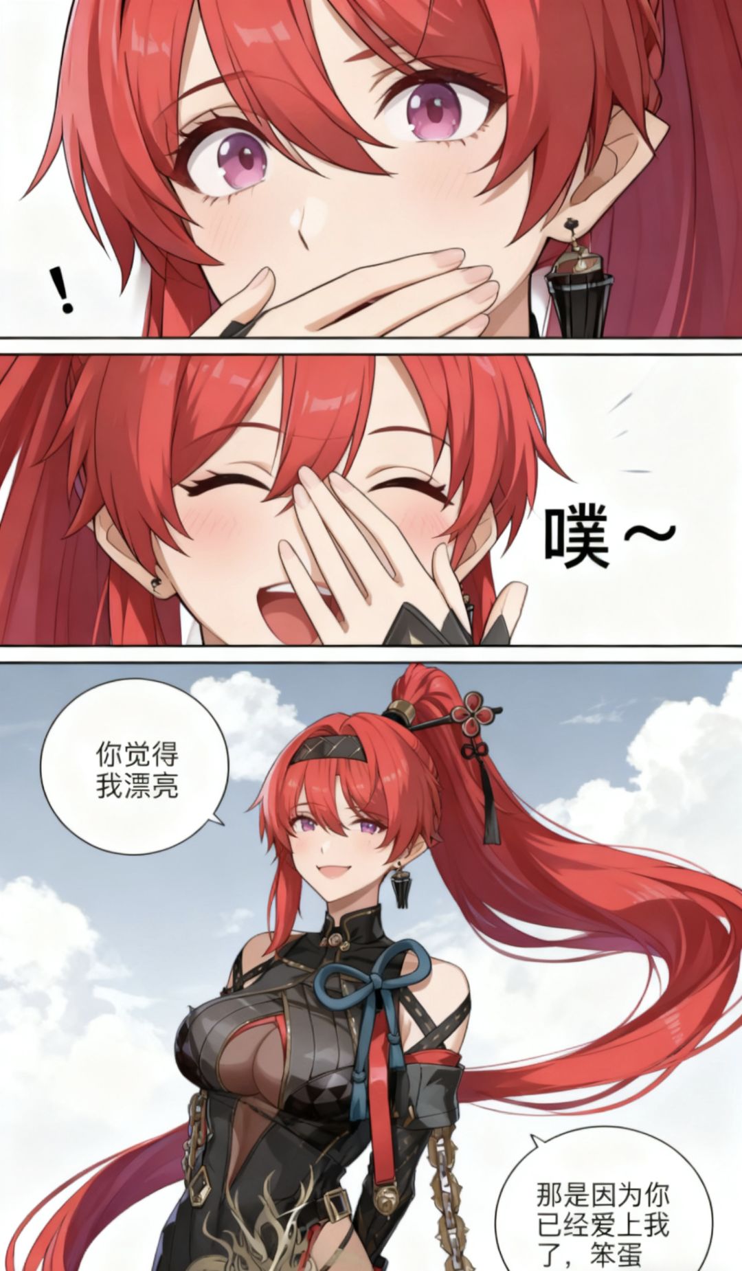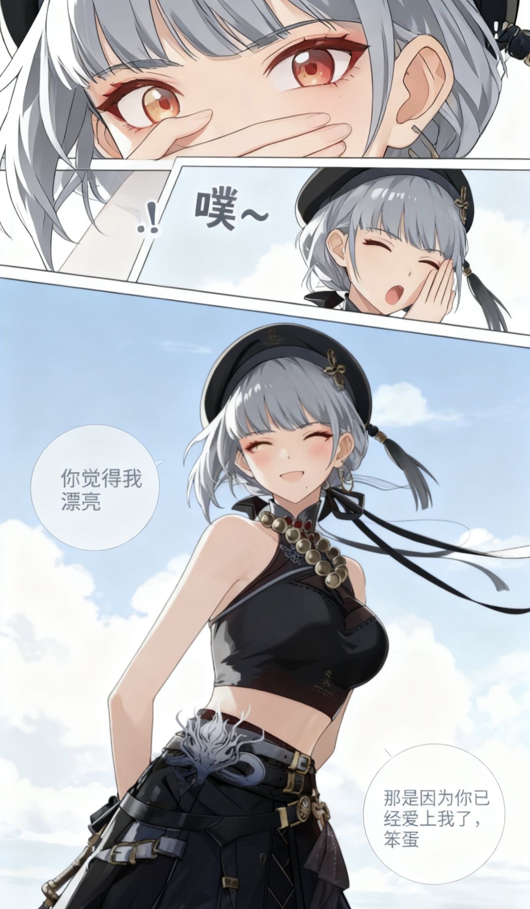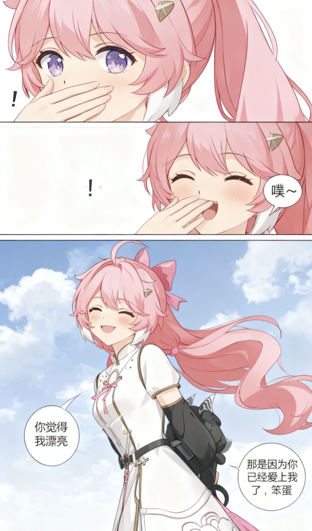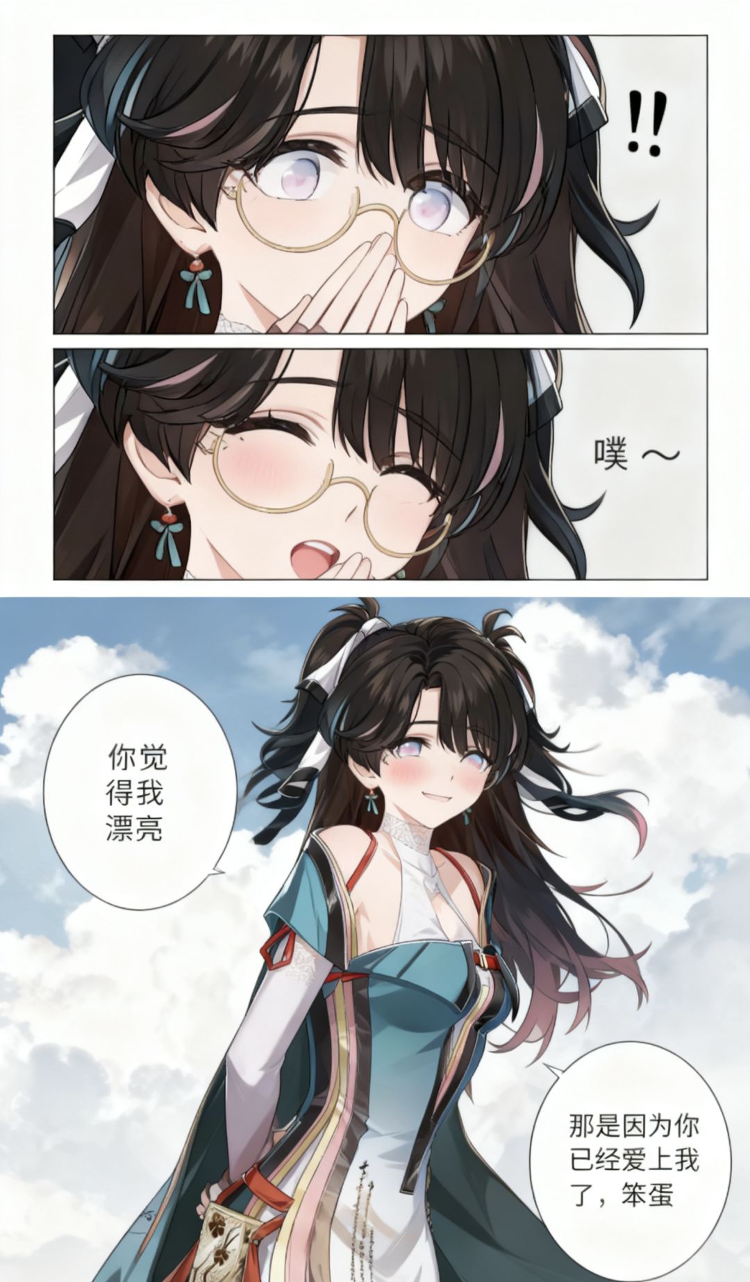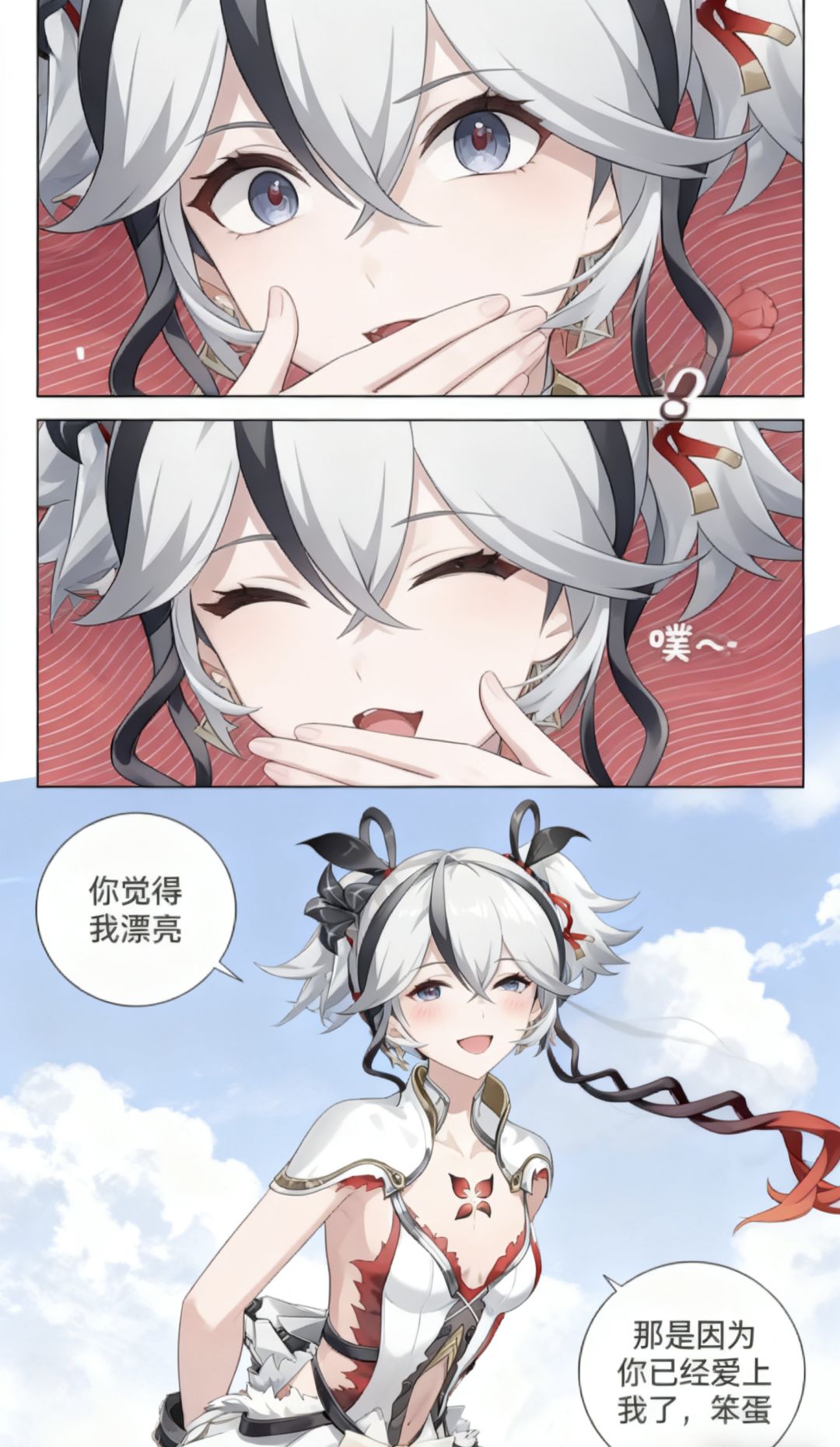 焚决:#鸣潮 #鸣潮创作激励 #鸣潮漂泊者 生成一张三格漫画,画面上方三分之一处的左半部分是第一格,右半部分是第二格,画面下方占总画面三分之二的位置是第三格。要求人物长相服装与参考图完全一致。第一格为人物的面部特写,眼睛睁大,眼神中带着一丝惊讶,嘴巴被一只手轻轻捂住,旁边配有一个 “!” 的符号,整体神态呈现出意外、略带羞怯的感觉,动作上是单手掩口,姿态显得较为娇俏。第二格也是人物的面部特写,眼睛眯起,呈现出笑意,嘴巴微张,那只捂住嘴的手还保持着动作,同时有 “噗~” 的拟声词,神态是开心、俏皮的,仿佛是忍不住要笑出声,动作上延续了掩口的姿态,却多了几分活泼的情绪。第三格背景是有云朵的天空,画面只出现了人物的上半身,人物画风与参考图完全一致。人物的发丝被风吹起,眼睛弯弯,面带柔和的笑容,脸颊还有淡淡的红晕。她姿态放松,身体略向前倾,双手背在身后,整体神态是自信且温柔,呈现出一种大方又迷人的状态。第三格左边有圆形对话框,写着“你觉得我漂亮”。右侧下方有圆形对话框,写着“那是因为你已经爱上我了,笨蛋”。