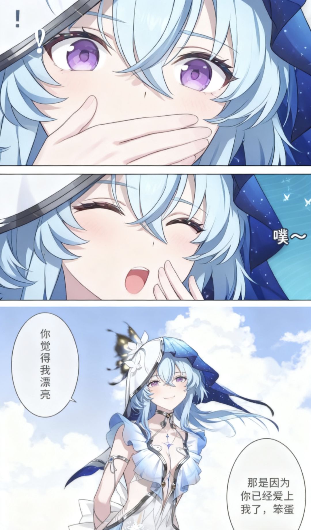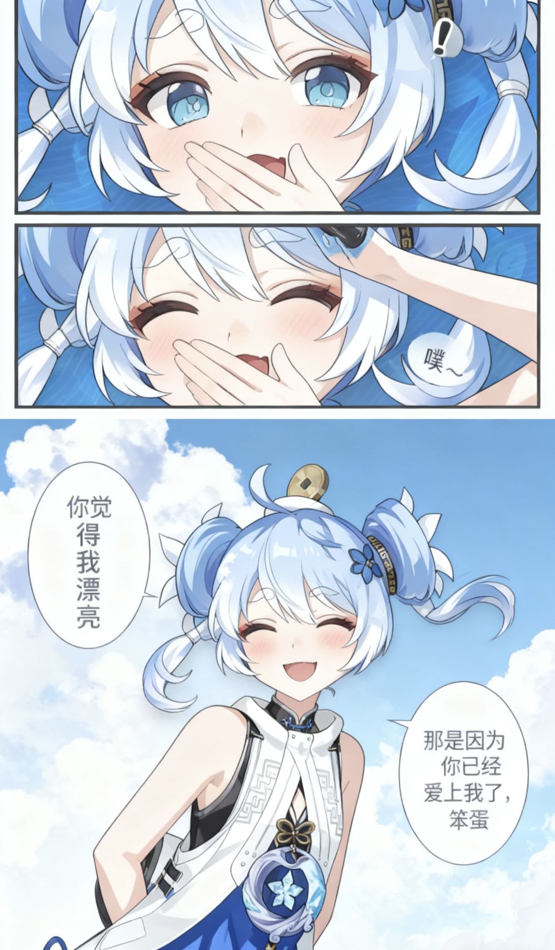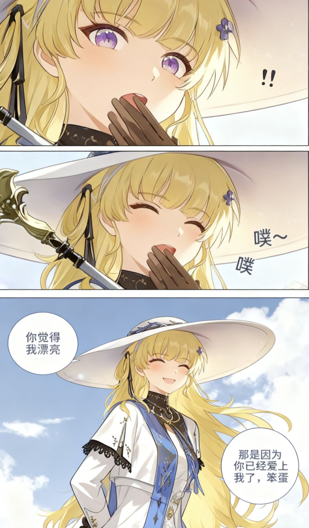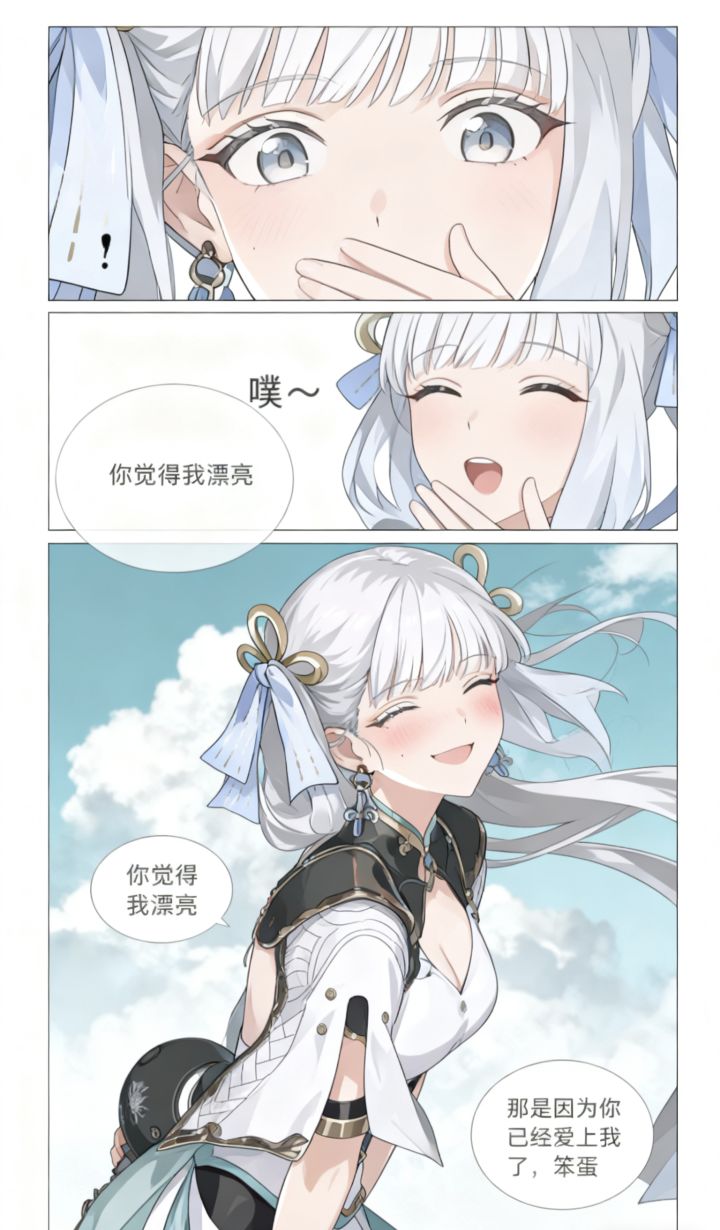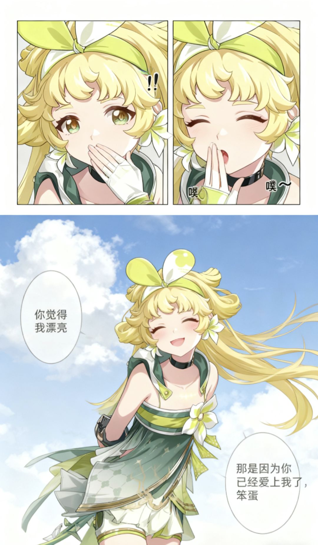 焚决:#鸣潮 #鸣潮创作激励 #鸣潮漂泊者 生成一张三格漫画,画面上方三分之一处的左半部分是第一格,右半部分是第二格,画面下方占总画面三分之二的位置是第三格。要求人物长相服装与参考图完全一致。第一格为人物的面部特写,眼睛睁大,眼神中带着一丝惊讶,嘴巴被一只手轻轻捂住,旁边配有一个 “!” 的符号,整体神态呈现出意外、略带羞怯的感觉,动作上是单手掩口,姿态显得较为娇俏。第二格也是人物的面部特写,眼睛眯起,呈现出笑意,嘴巴微张,那只捂住嘴的手还保持着动作,同时有 “噗~” 的拟声词,神态是开心、俏皮的,仿佛是忍不住要笑出声,动作上延续了掩口的姿态,却多了几分活泼的情绪。第三格背景是有云朵的天空,画面只出现了人物的上半身,人物画风与参考图完全一致。人物的发丝被风吹起,眼睛弯弯,面带柔和的笑容,脸颊还有淡淡的红晕。她姿态放松,身体略向前倾,双手背在身后,整体神态是自信且温柔,呈现出一种大方又迷人的状态。第三格左边有圆形对话框,写着“你觉得我漂亮”。右侧下方有圆形对话框,写着“那是因为你已经爱上我了,笨蛋”。