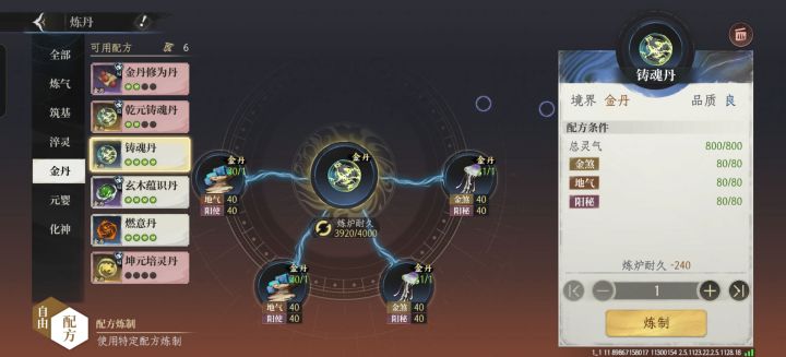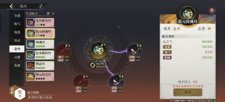 金丹期金色丹药需要三种属性各320点,但是总灵气不要超过1600,不然就会变成元婴期普通丹药