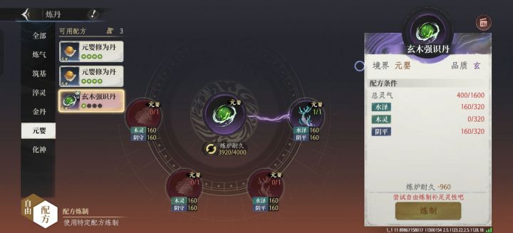 淬灵材料不够可以去找金丹元婴的买蓝色紫色材料,添加一两颗金丹或元婴材料来凑够五行属性,但是总灵气不要超过800,不然就会变成金丹期普通丹药,如图所示。