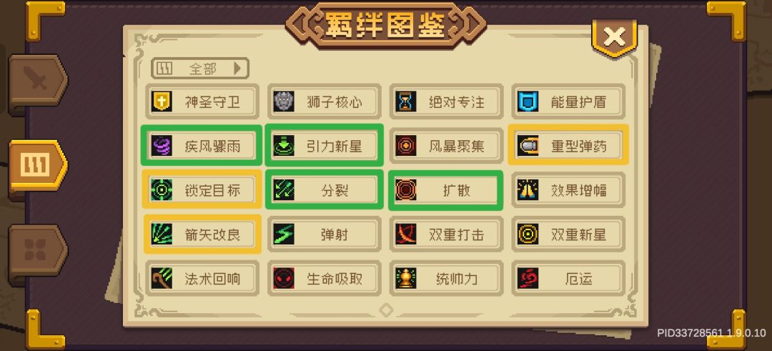 3元素亲和(红冠) 3连击(红冠) 3疾风骤雨 3分裂 3目标锁定 3重型弹药 3箭矢改良 1智能施法 1扩散 1引力新星 副武器红冠1神圣守卫