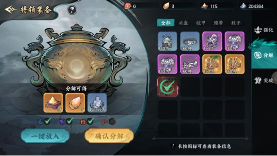 有多余低属性评分的装备可以选择分解,分解后可获取一定的铁矿资源。
