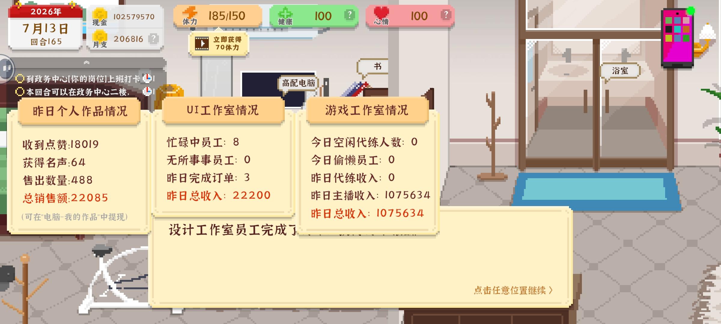 70回合内:基本上生活无忧无虑,可以考虑副业(优先公务员考试房子优惠),给游戏内充值,买装备提升星级、经验等等
